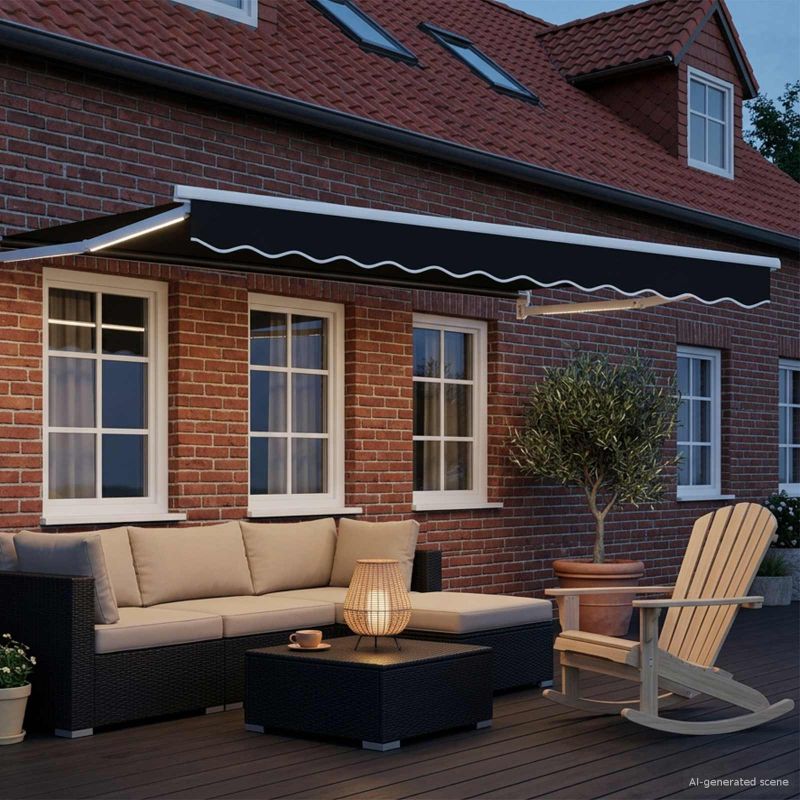 Този ръчен сенник с LED светлини на соларни батерии прави сянка и осветление за тераси, градини и всякакви открити пространства. Може да го нагласите както искате, а соларните LED светлини осветяват всичко вечер, без нужда от контакти. Водоустойчив плат: Изработен е от полиестер с ПУ покритие, за да е устойчив на слънчевата светлина и дъжда. Идеален за често ползване навън! Здрава рамка: Рамката е стоманена и алуминиева, което ѝ дава стабилност, а материалите са устойчиви на корозия. Качеството на конструкцията е на високо ниво! Ръчно управление: Сенникът идва с ръчна дръжка за разтягане и прибирате на сенника, позволявайки ви да регулирате сянката според слънцето. Соларно LED осветление: Има соларни LED лампи, които зареждат през деня за осветление вечер, без нужда от допълнителни захранващи устройства. Инсталационни компоненти: Включен е всичко нужно за поставянето. Следвайте инструкциите и ще го монтирате бързо и сигурно.