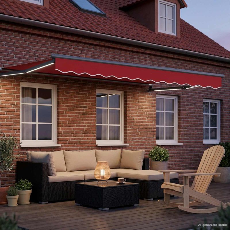 Този ръчен сенник с LED светлини на соларни батерии прави сянка и осветление за тераси, градини и всякакви открити пространства. Може да го нагласите както искате, а соларните LED светлини осветяват всичко вечер, без нужда от контакти. Водоустойчив плат: Изработен е от полиестер с ПУ покритие, за да е устойчив на слънчевата светлина и дъжда. Идеален за често ползване навън! Здрава рамка: Рамката е стоманена и алуминиева, което ѝ дава стабилност, а материалите са устойчиви на корозия. Качеството на конструкцията е на високо ниво! Ръчно управление: Сенникът идва с ръчна дръжка за разтягане и прибирате на сенника, позволявайки ви да регулирате сянката според слънцето. Соларно LED осветление: Има соларни LED лампи, които зареждат през деня за осветление вечер, без нужда от допълнителни захранващи устройства. Инсталационни компоненти: Включен е всичко нужно за поставянето. Следвайте инструкциите и ще го монтирате бързо и сигурно.