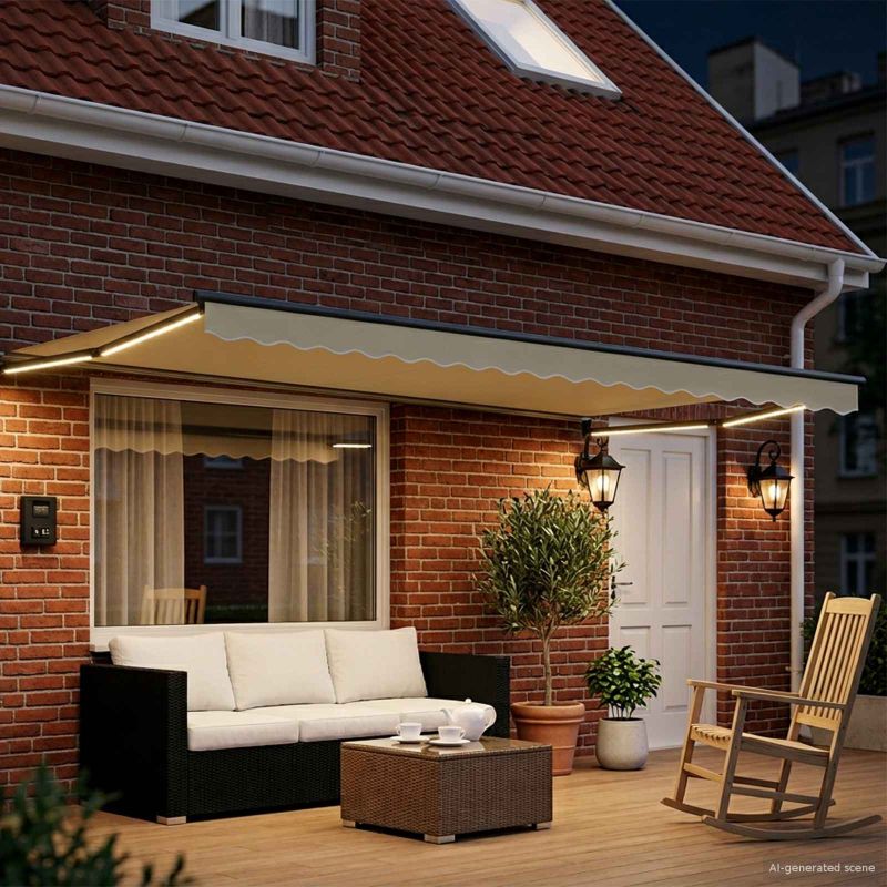 Този ръчен сенник с LED светлини на соларни батерии прави сянка и осветление за тераси, градини и всякакви открити пространства. Може да го нагласите както искате, а соларните LED светлини осветяват всичко вечер, без нужда от контакти. Водоустойчив плат: Изработен е от полиестер с ПУ покритие, за да е устойчив на слънчевата светлина и дъжда. Идеален за често ползване навън! Здрава рамка: Рамката е стоманена и алуминиева, което ѝ дава стабилност, а материалите са устойчиви на корозия. Качеството на конструкцията е на високо ниво! Ръчно управление: Сенникът идва с ръчна дръжка за разтягане и прибирате на сенника, позволявайки ви да регулирате сянката според слънцето. Соларно LED осветление: Има соларни LED лампи, които зареждат през деня за осветление вечер, без нужда от допълнителни захранващи устройства. Инсталационни компоненти: Включен е всичко нужно за поставянето. Следвайте инструкциите и ще го монтирате бързо и сигурно.