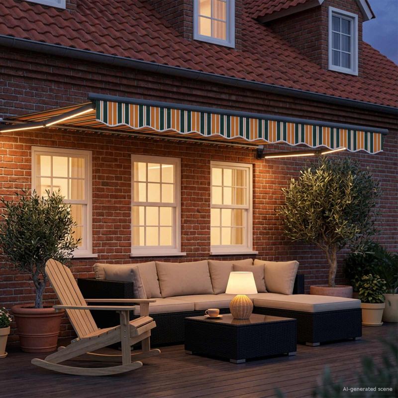 Този ръчен сенник с LED светлини на соларни батерии прави сянка и осветление за тераси, градини и всякакви открити пространства. Може да го нагласите както искате, а соларните LED светлини осветяват всичко вечер, без нужда от контакти. Водоустойчив плат: Изработен е от полиестер с ПУ покритие, за да е устойчив на слънчевата светлина и дъжда. Идеален за често ползване навън! Здрава рамка: Рамката е стоманена и алуминиева, което ѝ дава стабилност, а материалите са устойчиви на корозия. Качеството на конструкцията е на високо ниво! Ръчно управление: Сенникът идва с ръчна дръжка за разтягане и прибирате на сенника, позволявайки ви да регулирате сянката според слънцето. Соларно LED осветление: Има соларни LED лампи, които зареждат през деня за осветление вечер, без нужда от допълнителни захранващи устройства. Инсталационни компоненти: Включен е всичко нужно за поставянето. Следвайте инструкциите и ще го монтирате бързо и сигурно.