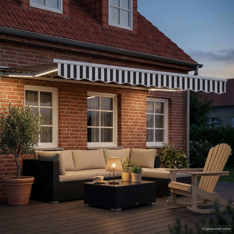 Този супер готин електрически подвижен сенник е точно това, от което се нуждае твоето открито пространство! Осигурява регулируема сянка и е перфектен за всяка градина или тераса, комбинирайки стил и функция. Представи си да си на спокойна места и да се наслаждаваш на природата, защитен от силното слънце. Сенникът се закрепва красиво на стената, като не заема много място, а предлага голямо покритие. Устойчив материал: Изработен от полиестер с PU покритие, материалът на сенника е супер здрав и подходящ за всякакво време през годината. Освен, че е як, цветът му не избледнява и твоето открито пространство изглежда отлично винаги. Лесна работа: Сенникът идва с дистанционно и ръчна дръжка, което го прави супер готин за управление. Бързо можеш да сменяш сянката или да настроиш всичко за забавления с приятели. Стабилна рамка: Здравата рамка от прахово боядисана стомана и алуминий осигурява дълговечност – ултра стабилна! Праховото покритие я защитава от износване, така че всичко работи гладко. Лесен монтаж: Стенният монтаж е лесен с предоставените компоненти. Настройването е супер бързо и просто, а включените инструкции правят всичко още по-лесно! Практичен дизайн: Полу-касетният дизайн е не само готин, а и много удобен; скрива механизма, а същевременно предлага стегната и линейна защита. Сенникът плътно лежи на стената на сградата, оптимизирайки пространството навън и е много ефективен при защита от времето.