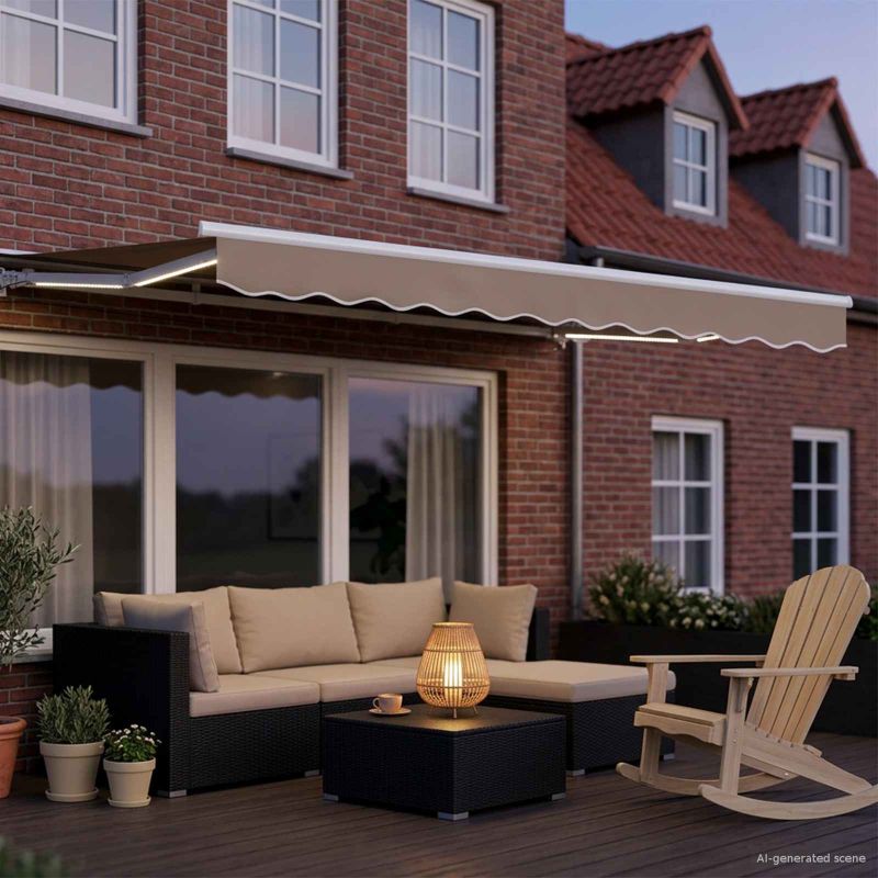 Този супер готин електрически подвижен сенник е точно това, от което се нуждае твоето открито пространство! Осигурява регулируема сянка и е перфектен за всяка градина или тераса, комбинирайки стил и функция. Представи си да си на спокойна места и да се наслаждаваш на природата, защитен от силното слънце. Сенникът се закрепва красиво на стената, като не заема много място, а предлага голямо покритие. Устойчив материал: Изработен от полиестер с PU покритие, материалът на сенника е супер здрав и подходящ за всякакво време през годината. Освен, че е як, цветът му не избледнява и твоето открито пространство изглежда отлично винаги. Лесна работа: Сенникът идва с дистанционно и ръчна дръжка, което го прави супер готин за управление. Бързо можеш да сменяш сянката или да настроиш всичко за забавления с приятели. Стабилна рамка: Здравата рамка от прахово боядисана стомана и алуминий осигурява дълговечност – ултра стабилна! Праховото покритие я защитава от износване, така че всичко работи гладко. Лесен монтаж: Стенният монтаж е лесен с предоставените компоненти. Настройването е супер бързо и просто, а включените инструкции правят всичко още по-лесно! Практичен дизайн: Полу-касетният дизайн е не само готин, а и много удобен; скрива механизма, а същевременно предлага стегната и линейна защита. Сенникът плътно лежи на стената на сградата, оптимизирайки пространството навън и е много ефективен при защита от времето.