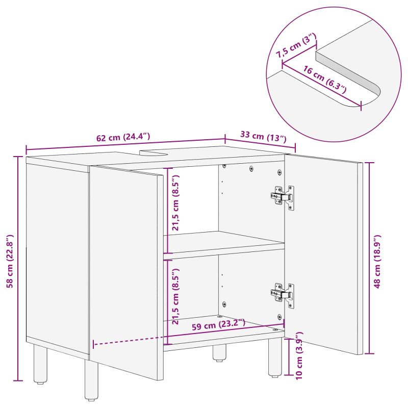 Този модерен шкаф за баня е съчетание от стил и функция, направен от масивна мангова дървесина. С размери 62 x 33 x 58 см, той е перфектно решение за всеки тип баня и е за тези, които харесват елегантността в простота. Правоъгълната му форма позволява удобно прилягане до стени или в тесни пространства, създавайки комбинация, която насърчава откритост. Проектиран е да побира най-различни банни принадлежности, този шкаф е практично решение за организиране. Масивна дървесина от манго: Изработен е от масивна мангова дървесина, която гарантира издръжливост и стил. Естествените шарки на дървото придават изтънчен вид, който остава красив с времето, а здравата конструкция го прави надежден мебелен елемент в банята ви. Правоъгълният дизайн: Умният правоъгълен формат му позволява да стои близо до стените, максимизирайки полезността в тясно пространство. Тази характеристика е ключова за бани с ограничен обем, предоставяйки решение, което не компрометира съхранението. Силуетът му добавя модерен детайл на интериора и лесно се вписва в различни стилове. Детайли за сглобяване: Доставя се с 1 х шкаф за баня, сглобяването изисква двама души. Това осигурява стабилност, когато е правилно сглобен, увеличавайки както безопасността, така и дълготрайността. Процесът е лесен и е важен за оптимална конструкция, подходяща за елегантната му форма. Ефективност на съхранение: С голям капацитет за съхранение, организирането на банни принадлежности става лесно и ефективно. Този шкаф предоставя достатъчно място за всичко - от козметика до хавлии, намалявайки безредиците и повишаваща общата чистота на банята. Грижа и поддръжка: Поддръжката е лесна - просто избърсвайте с влажна кърпа. Това позволявa на шкафа да запази добрия си вид без сложни процедури, което дава повече време за оценяване на неговата функция и красота.
