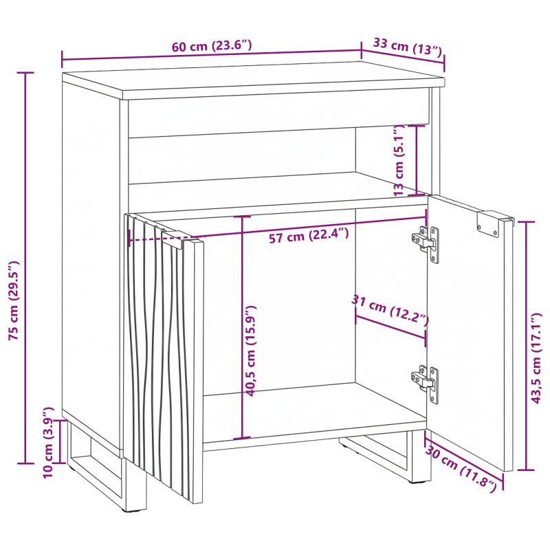Запознайте се с правоъгълния шкаф – комбинира рустикален чар и модерност, което го прави страхотен избор за всяка дневна или трапезария. С детайлен дизайн, правоъгълната форма му придава класически и съвременен вид, като подчертава грубата красота и практичната употреба. Двоен завършек и текстурана повърхност правят шкафа наистина привлекателен на вид и на допир, задължително допълнение към вашия домашен интериор. Масивно мангово дърво: Този шкаф внася топла и приветлива атмосфера във всяка стая. Избран заради здравината и дълготрайността си, става идеален за всякакъв стил на дома, усилвайки рустикалното усещане. Многофункционално съхранение: С рафтове и врати, предлага голямо пространство за съхранение, за да може всичко от трапезарни принадлежности до декорации да бъде подредено и чисто. Страхотен избор за организиран дом. Текстурен завършек: Текстурираната повърхност добавя рустикален стил и визуална дълбочина. Вълнообразният му модел привлича вниманието и прави шкафа впечатляващ акцент в всяка стая. Здравина на конструкцията: Направен от масивно мангово дърво и вторична инженерна дървесина, шкафът е създаден да бъде устойчив. Материалите го правят устойчив на износване, идеален за ежедневно ползване. Лесна поддръжка: Лесен е за сглобяване, а поддръжката е супер проста. Бързо почистване с мека, суха кърпа ще го поддържа страхотно изглеждащ.