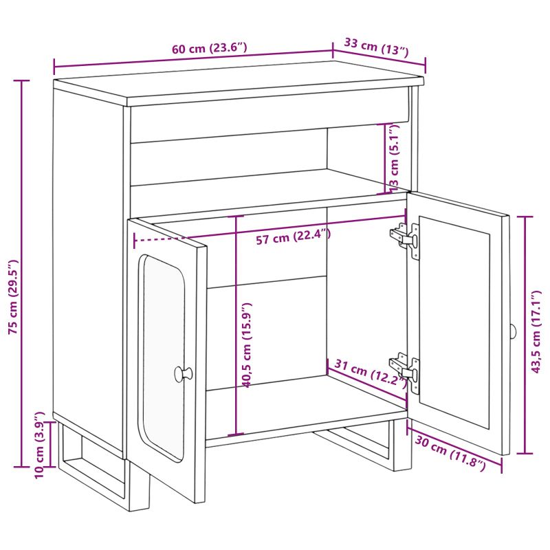Този модерен страничен шкаф е супер стилно решение за съхранение, което увеличава естетическата привлекателност на всяка трапезария или дневно пространство. Характеризира се с минималистичен правоъгълен дизайн, който лесно се вписва в модерни домове. Предлага достатъчно място за вашите основни вещи. Чистите линии и простото му оформление съчетават модерния стил, позволявайки същевременно да е функционален и красив за всички, които ценят баланса между полезност и креативен декор. Висококачествени материали: Изработен от масивно мангово дърво и инженерна дървесина, този шкаф носи дълготрайност и елегантност. Изборът на материали му придава модерен вид, който добре се комбинира с останалите мебели. Функционални компоненти: С практични задни панели и врати с панти, шкафът е чудесна комбинация между естетика и функция. Всеки детайл е проектиран за лесна употреба и добавя към общото излъчване. Гъвкавост в стаята: С размери 60 x 33.5 x 75 см, той се вписва идеално в различни интериори, особено трапезарии. Размерът и формата му допринасят за полезност, без да пречат на съществуващия декор. Елегантен дизайн: Квадратните метални крака спомагат за стабилността и добавят модерен акцент, правейки шкафа акцент в дома. Изисквания за сглобяване: Ако искате да сглобите шкафа, ще ви трябва помощ от втори човек и отверка – доставя се в едно цяло, проектирано да отговаря на нуждите ви от съхранение.