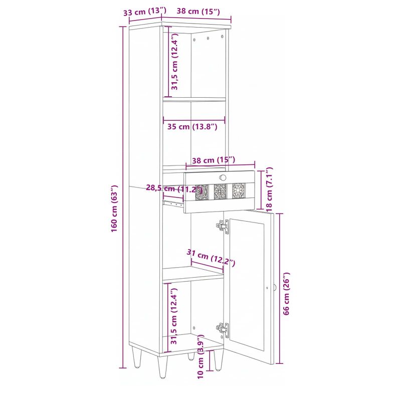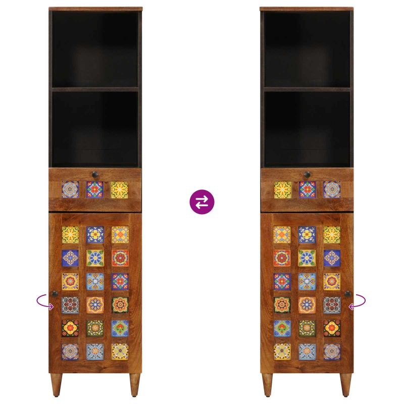 Този съвременен шкаф за баня е изключително прост и практичен, добавяйки стил към всяка баня. Чистият дизайн с прави линии и минималистичен вид го правят идеален за малки пространства. Той предлага гениални решения за съхранение, чудесен за семейства или за тези, които искат да поддържат своите принадлежности подредени и лесно достъпни. Масивно мангово дърво: Повърхността и вратите на шкафа са направени от здраво мангово дърво, което му придава естествен вид и така осигурява трайност. С работливостта си, шкафът запазва елегантността си дълго време. Функционален дизайн: Правоъгълната форма с размери 38 x 33.5 x 160 см е идеална за тънки бани, като не жертва мястото за съхранение. Чудесно съчетава стил и практичност, подобрявайки атмосферата в банята и запазвайки всичко в ред. Метални крака: Шкафът стои на стабилни черни метални крака, които придават контраст на дървото. Тези крака осигуряват нужната стабилност и правят по-лесно почистването под него, добавяйки модерен вид към дизайна. Възможности за интеграция: Създаден е да се вписва лесно в съвременни интерьори, минималистичният вид на шкафа координира чудесно с другите мебели в банята. Независимо дали с нови кърпи или съвременни мивки, той допълва разнообразие от стилове. Лесна поддръжка: Шкафът е проектиран за вътрешна употреба и е изключително лесен за поддръжка. Просто го избърсвайте с мокра кърпа, за да го поддържате свеж. С минималната си поддръжка, той остава стилен без усилия, носейки удобство за заети домакинства.