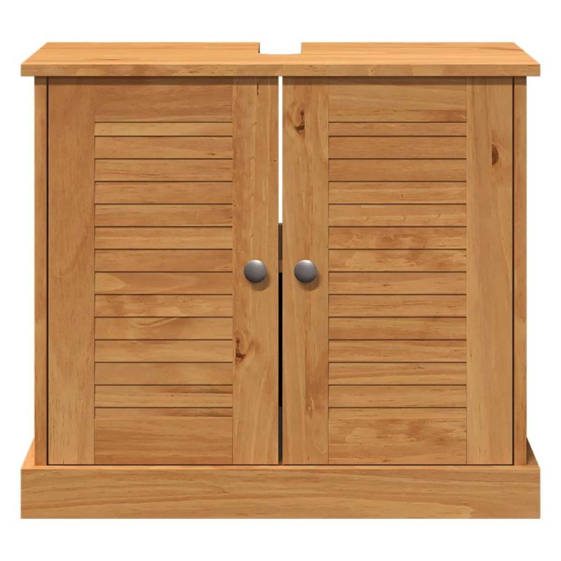 Този прекрасно изработен шкаф за мивка е страхотно допълнение за баня в винтидж стил. Създаден е да държи основните неща подредени и да направи района по-чист и стилен. Класическият ректангуларен дизайн отразява старите времена и добавя красота и функционално хранилище под мивката. С масивната борова дървесина, внасяте част от природата в интериора и създавате уютна и приветлива атмосфера. Материали: Изработен от масивна мангова дървесина и поддържан от инжeнерна дървесина, този шкаф е здрав и елегантен. Естественият вид на борова повърхност предлага винтидж стил, който е устойчив и внася топлина в интериора. Включени компоненти: Шкафът предлага различни отделения за удобно съхранение на основните вещи. Това е практично и привлекателно, като се интегрира идеално в интериора и подобрява организацията. Сглобяването изисква двама души и отвертка; идва готов за инсталация. Функционален дизайн: С конструкция, която поддържа реда, той съчетава естетиката с практичността. С достатъчно пространство за съхранение е идеален за заети домакинства, необходими за организация и структурирано складиране. Капацитет за съхранение: Перфектен за съхранение на хавлии, тоалетни принадлежности или почистващи средства, шкафът ви помага да поддържате ред в банята. Грижа и поддръжка: Само за вътрешна употреба, той изисква редовна грижа, за да поддържате естествената текстура на борова дървесина. Прашете с суха кърпа и избягвайте остри химикали за дълготраен вид.