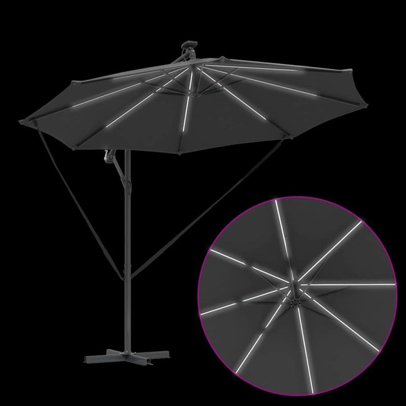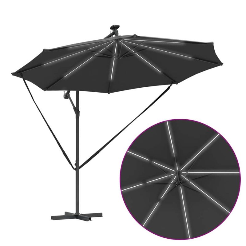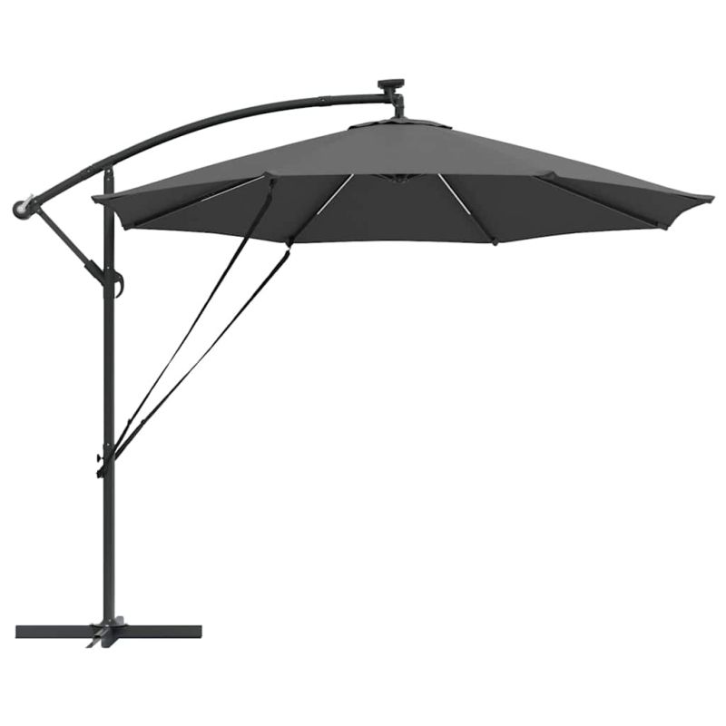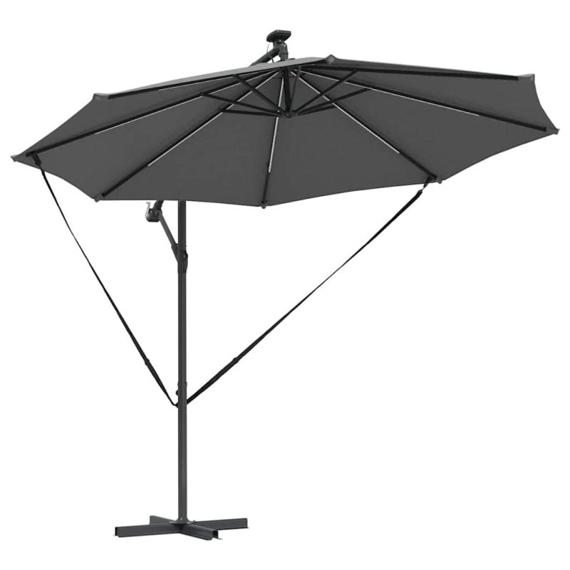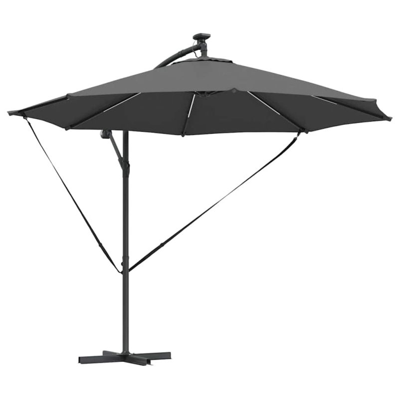 Този кантилеверен бананов чадър е супер акцент за вашето открито пространство. С модерен дизайн, той е практичен и стилен – идеален за градини, балкони и тераси. Лесно се комбинира с модерни мебели, осигурявайки нужната сянка и атмосфера за всяко събиране или просто за отдих навън. 360° Завъртане: С уникалния си дизайн, чадърът предлага 360-градусово завъртане, което ви позволява лесно да се нагласите за максимална защита от слънцето през целия ден. Въртенето е перфектно за динамично ползване на градината или пък откритите трапезарии. UV-Устойчив Тъкан: Навесът от полиестер е обработен с UV-защита. Това значи, че ще избегнете избледняване и щета от слънцето, а яркият вид на вашия външен декор ще се запази дори в горещите летни дни. LED Осветление: С енергийно ефективни LED лампи, захранвани от слънчева енергия, този чадър добавя елегантност и функционалност. Идеален за вечерни събирания, върху който ще се забавлявате и след залез слънце. Ръчен Механизъм: С ръчната манивела, този чадър е лесен за отваряне и затваряне, предоставяйки бърза и удобна сянка, когато е необходима. Системата с манивела е гладкия и удобна, идеална дори при ветровити дни. Издръжлива Алуминиева Рама: Здравата алуминиева конструкция осигурява стабилност, без да пречи на лесното придвижване. Лекотата на материала гарантира, че чадърът стои стабилно и е подходящ за всякакви открити пространства. Този продукт не трябва да се изхвърля заедно с други битови отпадъци в Европейския съюз.