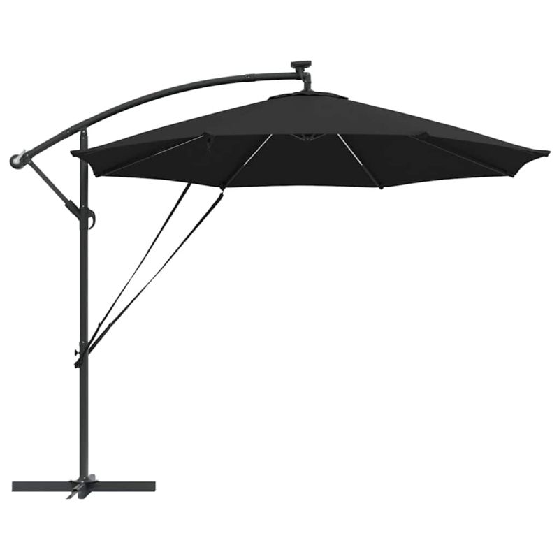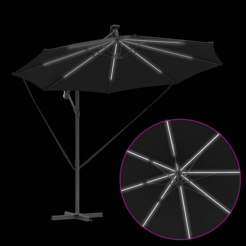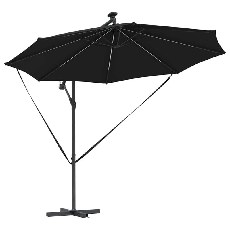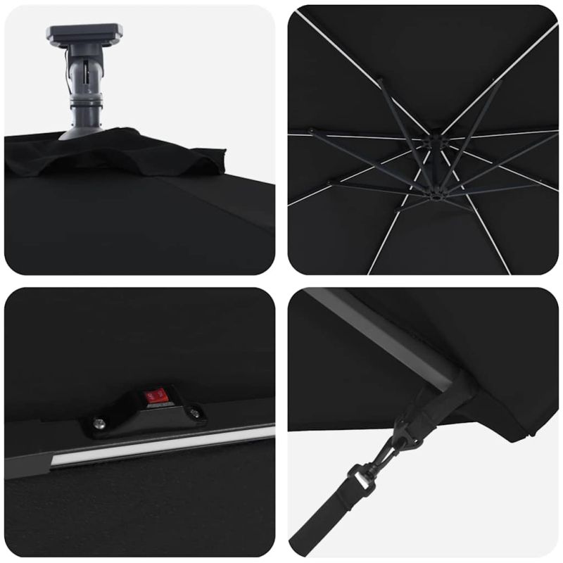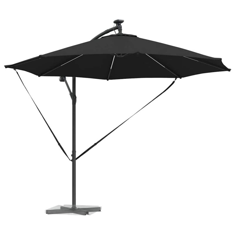Този кантилеверен бананов чадър е супер акцент за вашето открито пространство. С модерен дизайн, той е практичен и стилен – идеален за градини, балкони и тераси. Лесно се комбинира с модерни мебели, осигурявайки нужната сянка и атмосфера за всяко събиране или просто за отдих навън. 360° Завъртане: С уникалния си дизайн, чадърът предлага 360-градусово завъртане, което ви позволява лесно да се нагласите за максимална защита от слънцето през целия ден. Въртенето е перфектно за динамично ползване на градината или пък откритите трапезарии. UV-Устойчив Тъкан: Навесът от полиестер е обработен с UV-защита. Това значи, че ще избегнете избледняване и щета от слънцето, а яркият вид на вашия външен декор ще се запази дори в горещите летни дни. LED Осветление: С енергийно ефективни LED лампи, захранвани от слънчева енергия, този чадър добавя елегантност и функционалност. Идеален за вечерни събирания, върху който ще се забавлявате и след залез слънце. Ръчен Механизъм: С ръчната манивела, този чадър е лесен за отваряне и затваряне, предоставяйки бърза и удобна сянка, когато е необходима. Системата с манивела е гладкия и удобна, идеална дори при ветровити дни. Издръжлива Алуминиева Рама: Здравата алуминиева конструкция осигурява стабилност, без да пречи на лесното придвижване. Лекотата на материала гарантира, че чадърът стои стабилно и е подходящ за всякакви открити пространства. Този продукт не трябва да се изхвърля заедно с други битови отпадъци в Европейския съюз.