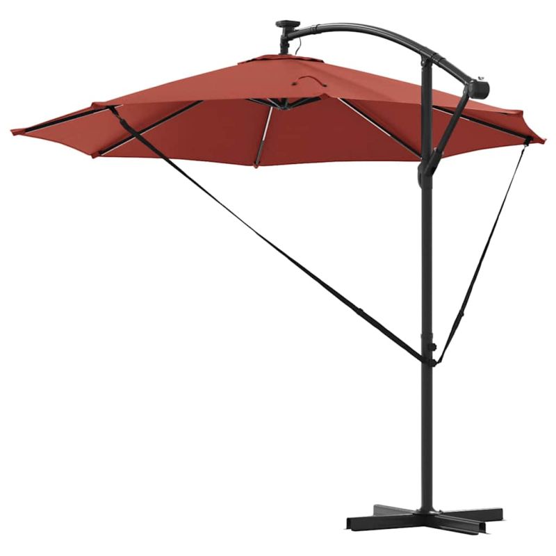 Този кантилеверен бананов чадър е супер акцент за вашето открито пространство. С модерен дизайн, той е практичен и стилен – идеален за градини, балкони и тераси. Лесно се комбинира с модерни мебели, осигурявайки нужната сянка и атмосфера за всяко събиране или просто за отдих навън. 360° Завъртане: С уникалния си дизайн, чадърът предлага 360-градусово завъртане, което ви позволява лесно да се нагласите за максимална защита от слънцето през целия ден. Въртенето е перфектно за динамично ползване на градината или пък откритите трапезарии. UV-Устойчив Тъкан: Навесът от полиестер е обработен с UV-защита. Това значи, че ще избегнете избледняване и щета от слънцето, а яркият вид на вашия външен декор ще се запази дори в горещите летни дни. LED Осветление: С енергийно ефективни LED лампи, захранвани от слънчева енергия, този чадър добавя елегантност и функционалност. Идеален за вечерни събирания, върху който ще се забавлявате и след залез слънце. Ръчен Механизъм: С ръчната манивела, този чадър е лесен за отваряне и затваряне, предоставяйки бърза и удобна сянка, когато е необходима. Системата с манивела е гладкия и удобна, идеална дори при ветровити дни. Издръжлива Алуминиева Рама: Здравата алуминиева конструкция осигурява стабилност, без да пречи на лесното придвижване. Лекотата на материала гарантира, че чадърът стои стабилно и е подходящ за всякакви открити пространства. Този продукт не трябва да се изхвърля заедно с други битови отпадъци в Европейския съюз.