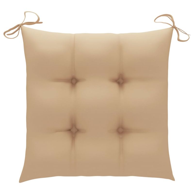 Тези дървени сгъваеми градински столове, отличаващи се със семпъл, но елегантен дизайн, са предназначени да ви донесат удобно изживяване при седене. Тази мебел от тик е изработена от изключително издръжлива тикова твърда дървесина, която е суха – изсушена в пещ, а след това фино шлифована, за да ѝ се придаде много гладък вид. Тиковото дърво е известно с изключителната си здравина и устойчивост на атмосферни влияния, което го прави далеч по-подходящо за градински мебели от всеки друг вид дърво. Тиковата дървесина е идеалният избор, ако искате да закупите дълготрайна градинска мебел. Шлифованата повърхност се почиства лесно с влажна кърпа. Тези градински трапезни столове са леки, което ги прави гъвкави и лесни за местене. Външните столове могат да се сгъват лесно, когато не се използват. Освен това плътно подплатените възглавници за седалките осигуряват допълнителен комфорт при седене. Максимално 110 кг на седалка.
