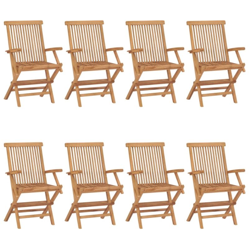 Този комплект дървени градински столове с възглавници, състоящ се от 8 елемента, е предназначен да бъде чудесно допълнение към вашата градина, тераса или вътрешен двор. Тази мебел от тик е изработена от изключително издръжлива тикова твърда дървесина, която е суха – изсушена в пещ, а след това фино шлифована, за да ѝ се придаде много гладък вид. Тиковото дърво е известно с изключителната си здравина и устойчивост на атмосферни влияния, което го прави далеч по-подходящо за градински мебели от всеки друг вид дърво. Тиковата дървесина е идеалният избор, ако искате да закупите дълготрайна градинска мебел. Шлифованата повърхност се почиства лесно с влажна кърпа. Тези градински столове са леки, което ги прави гъвкави и лесни за местене. Дървените столове могат да се сгъват, когато не се използват, за да се пести място. Освен това плътно подплатените възглавници за седалките осигуряват допълнителен комфорт при седене. Забележка: За да удължите живота на вашите градински мебели, ви препоръчваме да ги защитите с водоустойчиво покривало. Максимално 110 кг на седалка.