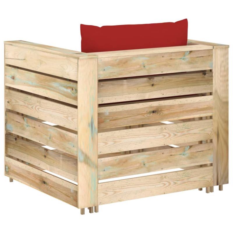 Този градински лаундж комплект представлява идеален избор, позволяващ ви да се отпуснете и да се насладите на времето, да подремнете или побъбрите със семейството или приятелите си. С непреходен палетен дизайн дървеният комплект мека мебел добавя нотка на рустик чар към вашия вътрешен двор, градина или всекидневна. Изработен от импрегнирана борова дървесина, палетният лаундж комплект е издръжлив и устойчив на атмосферни влияния. Този външен диван има здрава конструкция и изисква малко поддръжка. В комбинация с дебело подплатени възглавници, диванът осигурява максимален комфорт. В допълнение, модулният дизайн също така дава възможност да поставите комплекта във всяка подредба според вашия вкус. Забележка: За да удължите живота на вашите градински мебели, ви препоръчваме да ги защитите с водоустойчиво покритие.
