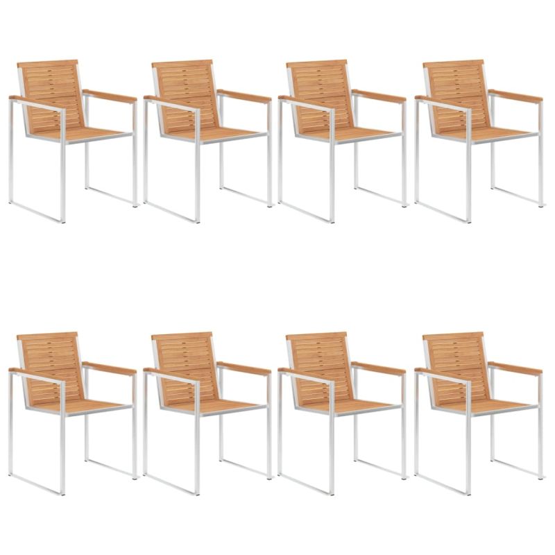 Тези дървени градински столове са проектирани да се превърнат във фокусна точка на вашата градина или вътрешен двор. Тази мебел от тик е изработена от изключително издръжлива тикова твърда дървесина, която е суха – изсушена в пещ, а след това фино шлифована, за да ѝ се придаде много гладък вид. Тиковото дърво е известно с изключителната си здравина и устойчивост на атмосферни влияния, което го прави далеч по-подходящо за градински мебели от всеки друг вид дърво. Тиковата дървесина е идеалният избор, ако искате да закупите дълготрайна градинска мебел. Рамката от висококачествена неръждаема стомана също ги прави изключително издръжливи, устойчиви на ръжда и здрави. Включената възглавница е повече от практично допълнение; тя има и декоративна функция. Седнете за прекрасна вечеря на открито или просто се отпуснете и се насладете на времето с този класически комплект градински столове. Забележка: За да удължите живота на вашите градински мебели, ви препоръчваме да ги защитите с водоустойчиво покритие.
