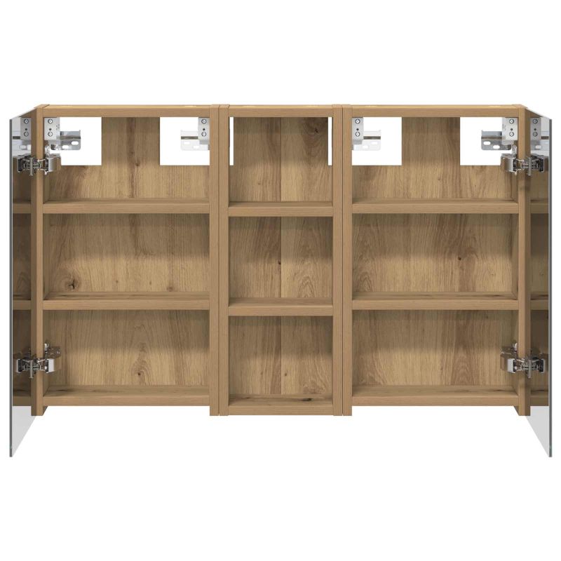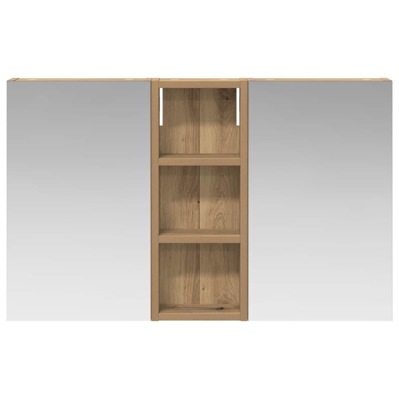 Този модерен банен комплект е олицетворение на стилната изтънченост, съчетавайки атрактивен дизайн с практическа функционалност. Проектиран за съвременния собственик на жилище, той действа както като шкаф за съхранение, така и като стилен акцент, който лесно се вписва в всяка баня. Осигурявайки достатъчно пространство с конфигурацията на стенния си дизайн, той спестява място на пода и позволява лесен достъп до основните неща. Комплектът подобрява атмосферата на банята с двупосочното огледало и LED осветление, създавайки удобна и организирана среда за ежедневните ритуали. Инженерна дървесина: Този шкаф е изработен от инженерна дървесина, позната с отличната си стабилност и издръжливост. Материалът е устойчив на деформация и повреди, осигурявайки дълготрайно парче за ежедневна употреба в банята. Гладкото му покритие придава елегантен вид, който е лесен за поддръжка. Простор за съхранение: Проектиран за максимална полезност, този шкаф предлага голямо пространство с множество рафтове и врати с панти. Добре обмисленото разположение позволява удобно организиране на санитарни принадлежности, осигурявайки всичко на ръка. Икономичният му дизайн повишава функционалността на банята, намалявайки безредиците. Инновативно двупосочно огледало: Тази уникална функция предлага уединение и видимост, а външната страна действа като стандартно огледало, докато вътрешната повърхност позволява дискретно наблюдение. Тази комбинация добавя стил и естетика в съвременните интериори. Ефективно LED осветление: С регулируеми LED ленти, захранвани от USB, шкафът осветява пространството с ярко и енергийно-ефективно осветление, което е особено приятно през нощта. Лесна поддръжка: Поддържането на този шкаф е супер лесно. Препоръчително е да използвате мек плат за почистване, а силните химикали да се избягват, за да се запази целостта на материала.