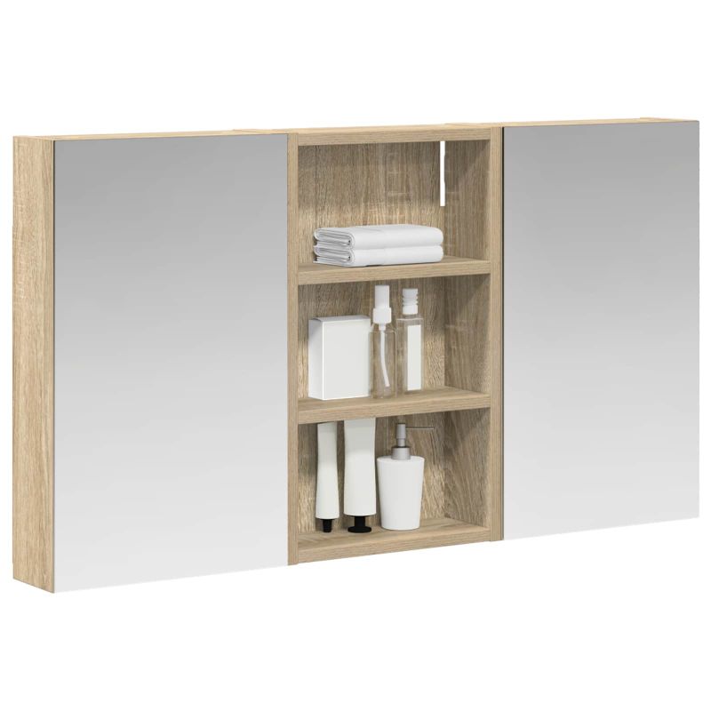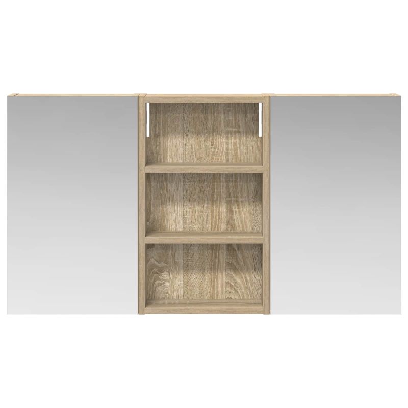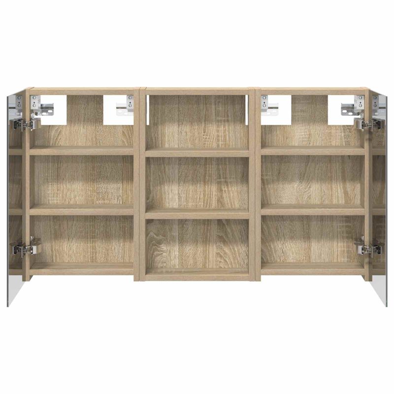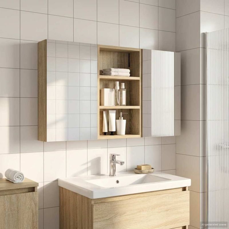 Този модерен банен комплект е олицетворение на стилната изтънченост, съчетавайки атрактивен дизайн с практическа функционалност. Проектиран за съвременния собственик на жилище, той действа както като шкаф за съхранение, така и като стилен акцент, който лесно се вписва в всяка баня. Осигурявайки достатъчно пространство с конфигурацията на стенния си дизайн, той спестява място на пода и позволява лесен достъп до основните неща. Комплектът подобрява атмосферата на банята с двупосочното огледало и LED осветление, създавайки удобна и организирана среда за ежедневните ритуали. Инженерна дървесина: Този шкаф е изработен от инженерна дървесина, позната с отличната си стабилност и издръжливост. Материалът е устойчив на деформация и повреди, осигурявайки дълготрайно парче за ежедневна употреба в банята. Гладкото му покритие придава елегантен вид, който е лесен за поддръжка. Простор за съхранение: Проектиран за максимална полезност, този шкаф предлага голямо пространство с множество рафтове и врати с панти. Добре обмисленото разположение позволява удобно организиране на санитарни принадлежности, осигурявайки всичко на ръка. Икономичният му дизайн повишава функционалността на банята, намалявайки безредиците. Инновативно двупосочно огледало: Тази уникална функция предлага уединение и видимост, а външната страна действа като стандартно огледало, докато вътрешната повърхност позволява дискретно наблюдение. Тази комбинация добавя стил и естетика в съвременните интериори. Ефективно LED осветление: С регулируеми LED ленти, захранвани от USB, шкафът осветява пространството с ярко и енергийно-ефективно осветление, което е особено приятно през нощта. Лесна поддръжка: Поддържането на този шкаф е супер лесно. Препоръчително е да използвате мек плат за почистване, а силните химикали да се избягват, за да се запази целостта на материала.