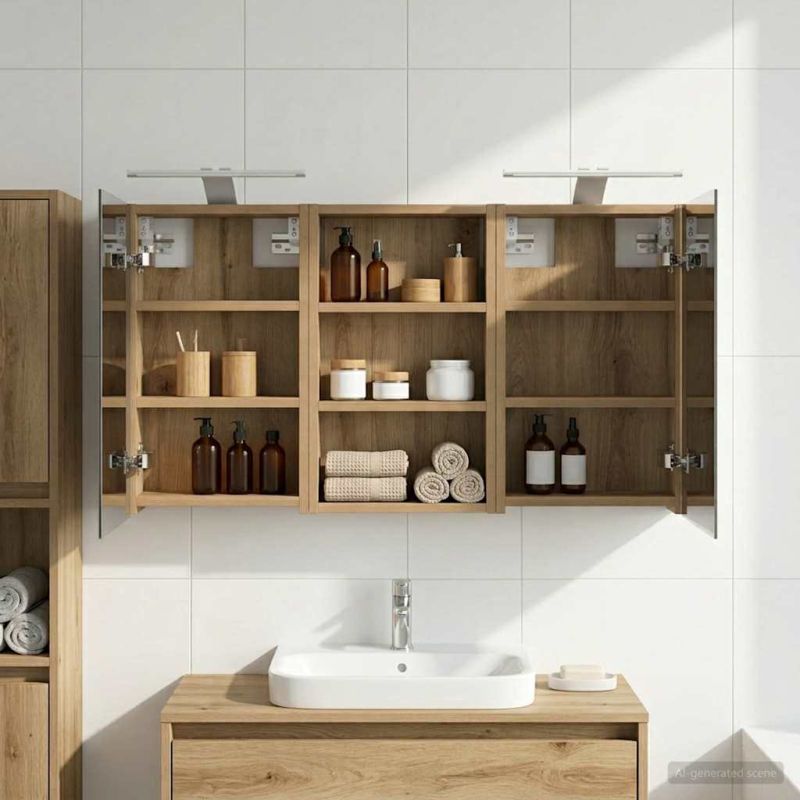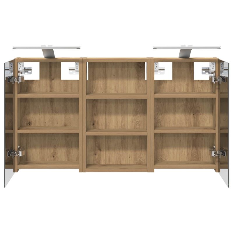 Този модерен банен комплект е олицетворение на стилната изтънченост, съчетавайки атрактивен дизайн с практическа функционалност. Проектиран за съвременния собственик на жилище, той действа както като шкаф за съхранение, така и като стилен акцент, който лесно се вписва в всяка баня. Осигурявайки достатъчно пространство с конфигурацията на стенния си дизайн, той спестява място на пода и позволява лесен достъп до основните неща. Комплектът подобрява атмосферата на банята с двупосочното огледало и LED осветление, създавайки удобна и организирана среда за ежедневните ритуали. Инженерна дървесина: Този шкаф е изработен от инженерна дървесина, позната с отличната си стабилност и издръжливост. Материалът е устойчив на деформация и повреди, осигурявайки дълготрайно парче за ежедневна употреба в банята. Гладкото му покритие придава елегантен вид, който е лесен за поддръжка. Простор за съхранение: Проектиран за максимална полезност, този шкаф предлага голямо пространство с множество рафтове и врати с панти. Добре обмисленото разположение позволява удобно организиране на санитарни принадлежности, осигурявайки всичко на ръка. Икономичният му дизайн повишава функционалността на банята, намалявайки безредиците. Инновативно двупосочно огледало: Тази уникална функция предлага уединение и видимост, а външната страна действа като стандартно огледало, докато вътрешната повърхност позволява дискретно наблюдение. Тази комбинация добавя стил и естетика в съвременните интериори. Ефективно LED осветление: С регулируеми LED ленти, захранвани от USB, шкафът осветява пространството с ярко и енергийно-ефективно осветление, което е особено приятно през нощта. Лесна поддръжка: Поддържането на този шкаф е супер лесно. Препоръчително е да използвате мек плат за почистване, а силните химикали да се избягват, за да се запази целостта на материала. Моля, обърнете внимание, че трябва да използвате само сертифициран вход DC 5V. По-високото напрежение може да доведе до прегряване и да повреди устройството, както и до потенциален риск от прегряване и пожар. Не свързвайте този продукт към захранване, различно от описаното в ръководството, на табелката с името или изрично препоръчано от vidaXL. Този уред не трябва да се използва от деца под 15 години, както и от лица с намалени физически, сетивни или умствени способности или с липса на опит и познания относно използването на електронни уреди. Електричеството е опасно. Повредите и неправилният монтаж, употреба или промяна (подмяна на отделни компоненти) могат да доведат до повреда на уреда , което да доведе до токов удар и опасност за потребителя. Не използвайте този продукт във взривоопасна атмосфера, като например при наличие на запалими течности, газове и прах, или при температура над 50 градуса по Целзий или повече. Не включвайте продукта, ако свързващият кабел или захранването са видимо повредени. Ако външният гъвкав кабел или захранващ кабел на това осветително тяло е повреден, той трябва да бъде заменен изключително от производителя или негов сервизен агент, или от подобно квалифицирано лице, за да се избегне опасност. Изключете захранването по време на монтажа и поддръжката. Уверете се, че крушките са изстинали. Светлинният източник на това осветително тяло не може да се заменя; когато светлинният източник д