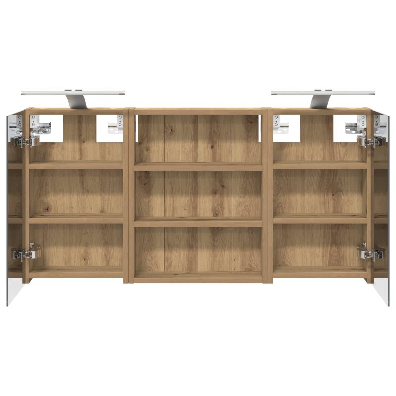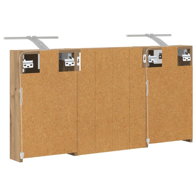 Този модерен банен комплект е олицетворение на стилната изтънченост, съчетавайки атрактивен дизайн с практическа функционалност. Проектиран за съвременния собственик на жилище, той действа както като шкаф за съхранение, така и като стилен акцент, който лесно се вписва в всяка баня. Осигурявайки достатъчно пространство с конфигурацията на стенния си дизайн, той спестява място на пода и позволява лесен достъп до основните неща. Комплектът подобрява атмосферата на банята с двупосочното огледало и LED осветление, създавайки удобна и организирана среда за ежедневните ритуали. Инженерна дървесина: Този шкаф е изработен от инженерна дървесина, позната с отличната си стабилност и издръжливост. Материалът е устойчив на деформация и повреди, осигурявайки дълготрайно парче за ежедневна употреба в банята. Гладкото му покритие придава елегантен вид, който е лесен за поддръжка. Простор за съхранение: Проектиран за максимална полезност, този шкаф предлага голямо пространство с множество рафтове и врати с панти. Добре обмисленото разположение позволява удобно организиране на санитарни принадлежности, осигурявайки всичко на ръка. Икономичният му дизайн повишава функционалността на банята, намалявайки безредиците. Инновативно двупосочно огледало: Тази уникална функция предлага уединение и видимост, а външната страна действа като стандартно огледало, докато вътрешната повърхност позволява дискретно наблюдение. Тази комбинация добавя стил и естетика в съвременните интериори. Ефективно LED осветление: С регулируеми LED ленти, захранвани от USB, шкафът осветява пространството с ярко и енергийно-ефективно осветление, което е особено приятно през нощта. Лесна поддръжка: Поддържането на този шкаф е супер лесно. Препоръчително е да използвате мек плат за почистване, а силните химикали да се избягват, за да се запази целостта на материала. Моля, обърнете внимание, че трябва да използвате само сертифициран вход DC 5V. По-високото напрежение може да доведе до прегряване и да повреди устройството, както и до потенциален риск от прегряване и пожар. Не свързвайте този продукт към захранване, различно от описаното в ръководството, на табелката с името или изрично препоръчано от vidaXL. Този уред не трябва да се използва от деца под 15 години, както и от лица с намалени физически, сетивни или умствени способности или с липса на опит и познания относно използването на електронни уреди. Електричеството е опасно. Повредите и неправилният монтаж, употреба или промяна (подмяна на отделни компоненти) могат да доведат до повреда на уреда , което да доведе до токов удар и опасност за потребителя. Не използвайте този продукт във взривоопасна атмосфера, като например при наличие на запалими течности, газове и прах, или при температура над 50 градуса по Целзий или повече. Не включвайте продукта, ако свързващият кабел или захранването са видимо повредени. Ако външният гъвкав кабел или захранващ кабел на това осветително тяло е повреден, той трябва да бъде заменен изключително от производителя или негов сервизен агент, или от подобно квалифицирано лице, за да се избегне опасност. Изключете захранването по време на монтажа и поддръжката. Уверете се, че крушките са изстинали. Светлинният източник на това осветително тяло не може да се заменя; когато светлинният източник д