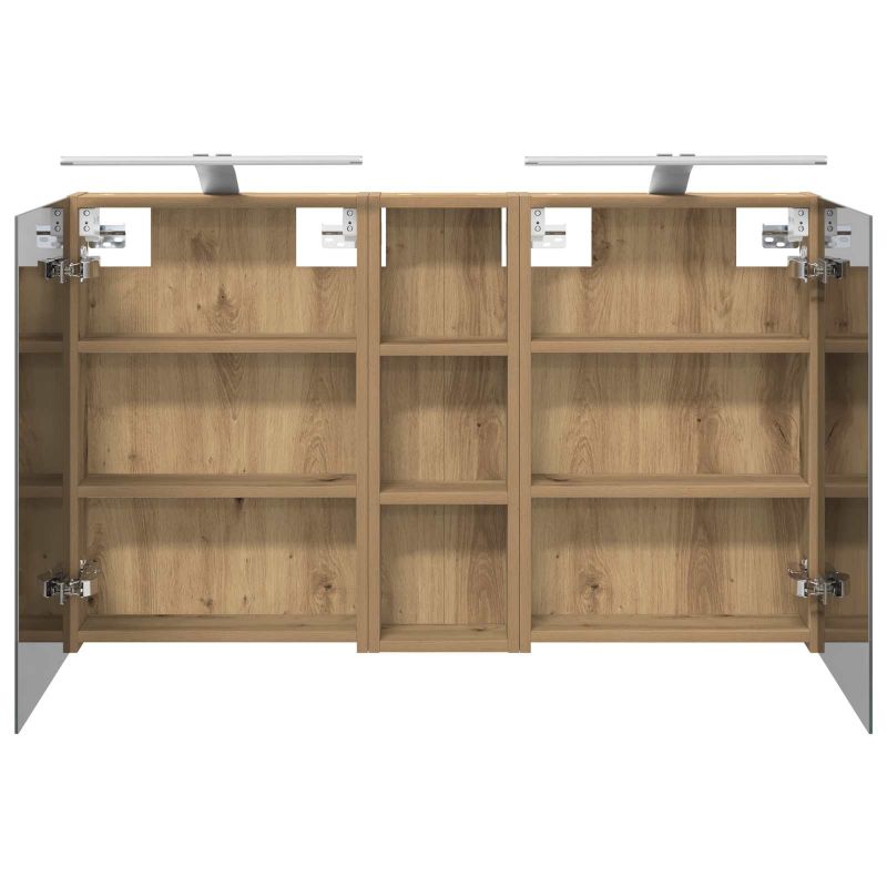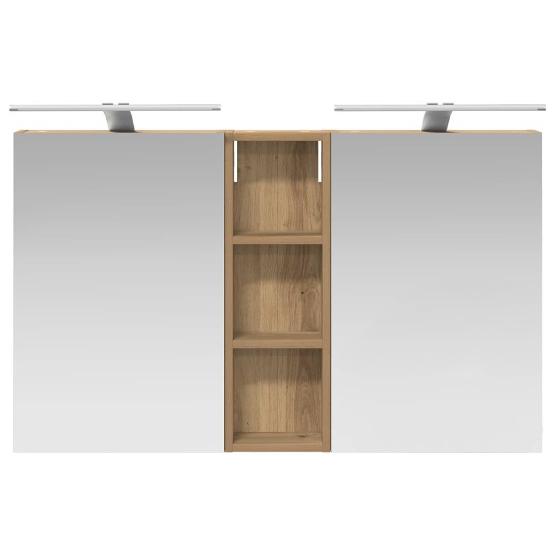Този модерен банен комплект е олицетворение на стилната изтънченост, съчетавайки атрактивен дизайн с практическа функционалност. Проектиран за съвременния собственик на жилище, той действа както като шкаф за съхранение, така и като стилен акцент, който лесно се вписва в всяка баня. Осигурявайки достатъчно пространство с конфигурацията на стенния си дизайн, той спестява място на пода и позволява лесен достъп до основните неща. Комплектът подобрява атмосферата на банята с двупосочното огледало и LED осветление, създавайки удобна и организирана среда за ежедневните ритуали. Инженерна дървесина: Този шкаф е изработен от инженерна дървесина, позната с отличната си стабилност и издръжливост. Материалът е устойчив на деформация и повреди, осигурявайки дълготрайно парче за ежедневна употреба в банята. Гладкото му покритие придава елегантен вид, който е лесен за поддръжка. Простор за съхранение: Проектиран за максимална полезност, този шкаф предлага голямо пространство с множество рафтове и врати с панти. Добре обмисленото разположение позволява удобно организиране на санитарни принадлежности, осигурявайки всичко на ръка. Икономичният му дизайн повишава функционалността на банята, намалявайки безредиците. Инновативно двупосочно огледало: Тази уникална функция предлага уединение и видимост, а външната страна действа като стандартно огледало, докато вътрешната повърхност позволява дискретно наблюдение. Тази комбинация добавя стил и естетика в съвременните интериори. Ефективно LED осветление: С регулируеми LED ленти, захранвани от USB, шкафът осветява пространството с ярко и енергийно-ефективно осветление, което е особено приятно през нощта. Лесна поддръжка: Поддържането на този шкаф е супер лесно. Препоръчително е да използвате мек плат за почистване, а силните химикали да се избягват, за да се запази целостта на материала. Моля, обърнете внимание, че трябва да използвате само сертифициран вход DC 5V. По-високото напрежение може да доведе до прегряване и да повреди устройството, както и до потенциален риск от прегряване и пожар. Не свързвайте този продукт към захранване, различно от описаното в ръководството, на табелката с името или изрично препоръчано от vidaXL. Този уред не трябва да се използва от деца под 15 години, както и от лица с намалени физически, сетивни или умствени способности или с липса на опит и познания относно използването на електронни уреди. Електричеството е опасно. Повредите и неправилният монтаж, употреба или промяна (подмяна на отделни компоненти) могат да доведат до повреда на уреда , което да доведе до токов удар и опасност за потребителя. Не използвайте този продукт във взривоопасна атмосфера, като например при наличие на запалими течности, газове и прах, или при температура над 50 градуса по Целзий или повече. Не включвайте продукта, ако свързващият кабел или захранването са видимо повредени. Ако външният гъвкав кабел или захранващ кабел на това осветително тяло е повреден, той трябва да бъде заменен изключително от производителя или негов сервизен агент, или от подобно квалифицирано лице, за да се избегне опасност. Изключете захранването по време на монтажа и поддръжката. Уверете се, че крушките са изстинали. Светлинният източник на това осветително тяло не може да се заменя; когато светлинният източник д