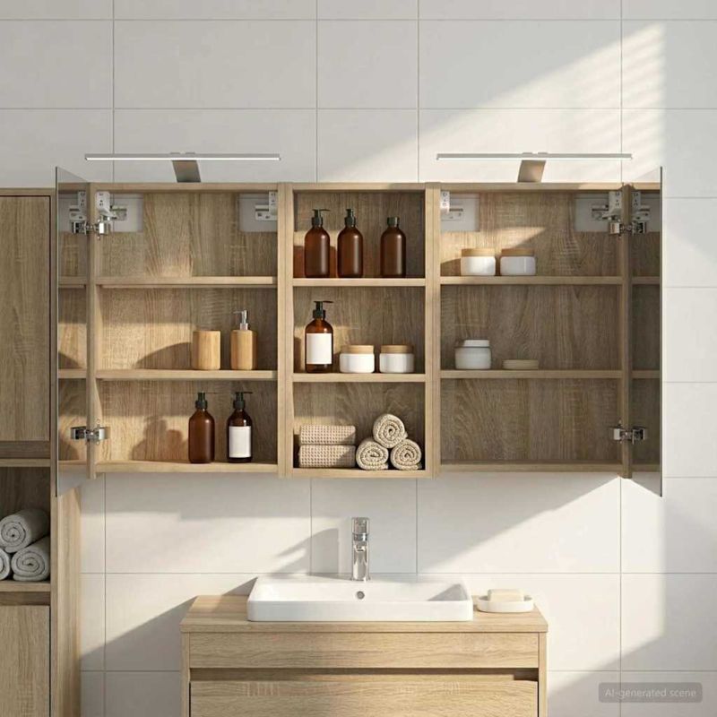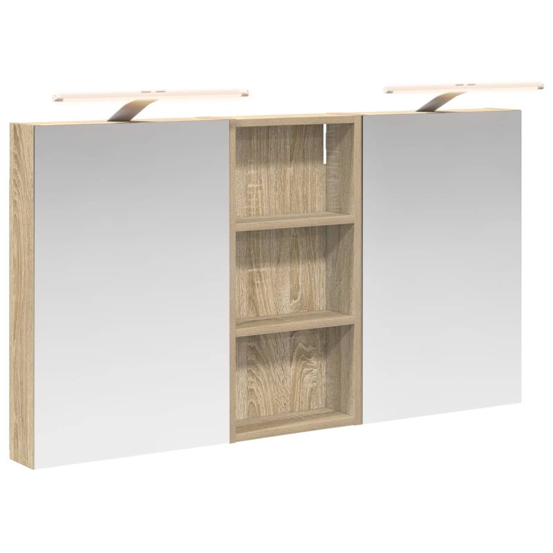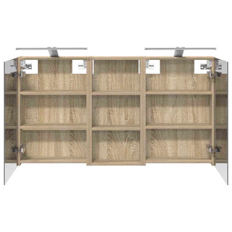 Този модерен банен комплект е олицетворение на стилната изтънченост, съчетавайки атрактивен дизайн с практическа функционалност. Проектиран за съвременния собственик на жилище, той действа както като шкаф за съхранение, така и като стилен акцент, който лесно се вписва в всяка баня. Осигурявайки достатъчно пространство с конфигурацията на стенния си дизайн, той спестява място на пода и позволява лесен достъп до основните неща. Комплектът подобрява атмосферата на банята с двупосочното огледало и LED осветление, създавайки удобна и организирана среда за ежедневните ритуали. Инженерна дървесина: Този шкаф е изработен от инженерна дървесина, позната с отличната си стабилност и издръжливост. Материалът е устойчив на деформация и повреди, осигурявайки дълготрайно парче за ежедневна употреба в банята. Гладкото му покритие придава елегантен вид, който е лесен за поддръжка. Простор за съхранение: Проектиран за максимална полезност, този шкаф предлага голямо пространство с множество рафтове и врати с панти. Добре обмисленото разположение позволява удобно организиране на санитарни принадлежности, осигурявайки всичко на ръка. Икономичният му дизайн повишава функционалността на банята, намалявайки безредиците. Инновативно двупосочно огледало: Тази уникална функция предлага уединение и видимост, а външната страна действа като стандартно огледало, докато вътрешната повърхност позволява дискретно наблюдение. Тази комбинация добавя стил и естетика в съвременните интериори. Ефективно LED осветление: С регулируеми LED ленти, захранвани от USB, шкафът осветява пространството с ярко и енергийно-ефективно осветление, което е особено приятно през нощта. Лесна поддръжка: Поддържането на този шкаф е супер лесно. Препоръчително е да използвате мек плат за почистване, а силните химикали да се избягват, за да се запази целостта на материала. Моля, обърнете внимание, че трябва да използвате само сертифициран вход DC 5V. По-високото напрежение може да доведе до прегряване и да повреди устройството, както и до потенциален риск от прегряване и пожар. Не свързвайте този продукт към захранване, различно от описаното в ръководството, на табелката с името или изрично препоръчано от vidaXL. Този уред не трябва да се използва от деца под 15 години, както и от лица с намалени физически, сетивни или умствени способности или с липса на опит и познания относно използването на електронни уреди. Електричеството е опасно. Повредите и неправилният монтаж, употреба или промяна (подмяна на отделни компоненти) могат да доведат до повреда на уреда , което да доведе до токов удар и опасност за потребителя. Не използвайте този продукт във взривоопасна атмосфера, като например при наличие на запалими течности, газове и прах, или при температура над 50 градуса по Целзий или повече. Не включвайте продукта, ако свързващият кабел или захранването са видимо повредени. Ако външният гъвкав кабел или захранващ кабел на това осветително тяло е повреден, той трябва да бъде заменен изключително от производителя или негов сервизен агент, или от подобно квалифицирано лице, за да се избегне опасност. Изключете захранването по време на монтажа и поддръжката. Уверете се, че крушките са изстинали. Светлинният източник на това осветително тяло не може да се заменя; когато светлинният източник д