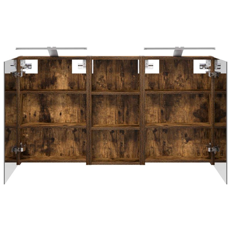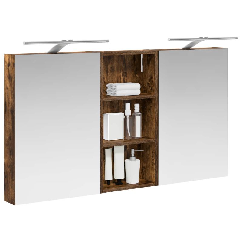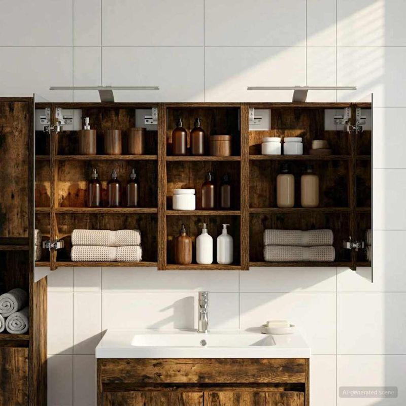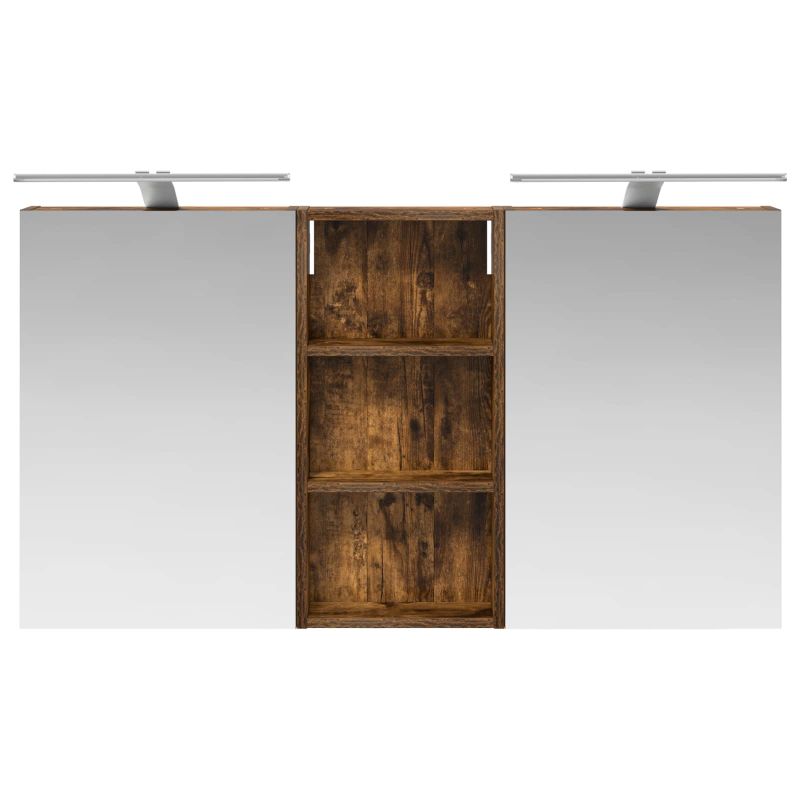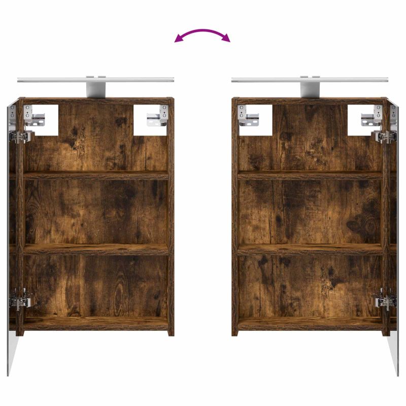 Този модерен банен комплект е олицетворение на стилната изтънченост, съчетавайки атрактивен дизайн с практическа функционалност. Проектиран за съвременния собственик на жилище, той действа както като шкаф за съхранение, така и като стилен акцент, който лесно се вписва в всяка баня. Осигурявайки достатъчно пространство с конфигурацията на стенния си дизайн, той спестява място на пода и позволява лесен достъп до основните неща. Комплектът подобрява атмосферата на банята с двупосочното огледало и LED осветление, създавайки удобна и организирана среда за ежедневните ритуали. Инженерна дървесина: Този шкаф е изработен от инженерна дървесина, позната с отличната си стабилност и издръжливост. Материалът е устойчив на деформация и повреди, осигурявайки дълготрайно парче за ежедневна употреба в банята. Гладкото му покритие придава елегантен вид, който е лесен за поддръжка. Простор за съхранение: Проектиран за максимална полезност, този шкаф предлага голямо пространство с множество рафтове и врати с панти. Добре обмисленото разположение позволява удобно организиране на санитарни принадлежности, осигурявайки всичко на ръка. Икономичният му дизайн повишава функционалността на банята, намалявайки безредиците. Инновативно двупосочно огледало: Тази уникална функция предлага уединение и видимост, а външната страна действа като стандартно огледало, докато вътрешната повърхност позволява дискретно наблюдение. Тази комбинация добавя стил и естетика в съвременните интериори. Ефективно LED осветление: С регулируеми LED ленти, захранвани от USB, шкафът осветява пространството с ярко и енергийно-ефективно осветление, което е особено приятно през нощта. Лесна поддръжка: Поддържането на този шкаф е супер лесно. Препоръчително е да използвате мек плат за почистване, а силните химикали да се избягват, за да се запази целостта на материала. Моля, обърнете внимание, че трябва да използвате само сертифициран вход DC 5V. По-високото напрежение може да доведе до прегряване и да повреди устройството, както и до потенциален риск от прегряване и пожар. Не свързвайте този продукт към захранване, различно от описаното в ръководството, на табелката с името или изрично препоръчано от vidaXL. Този уред не трябва да се използва от деца под 15 години, както и от лица с намалени физически, сетивни или умствени способности или с липса на опит и познания относно използването на електронни уреди. Електричеството е опасно. Повредите и неправилният монтаж, употреба или промяна (подмяна на отделни компоненти) могат да доведат до повреда на уреда , което да доведе до токов удар и опасност за потребителя. Не използвайте този продукт във взривоопасна атмосфера, като например при наличие на запалими течности, газове и прах, или при температура над 50 градуса по Целзий или повече. Не включвайте продукта, ако свързващият кабел или захранването са видимо повредени. Ако външният гъвкав кабел или захранващ кабел на това осветително тяло е повреден, той трябва да бъде заменен изключително от производителя или негов сервизен агент, или от подобно квалифицирано лице, за да се избегне опасност. Изключете захранването по време на монтажа и поддръжката. Уверете се, че крушките са изстинали. Светлинният източник на това осветително тяло не може да се заменя; когато светлинният източник д