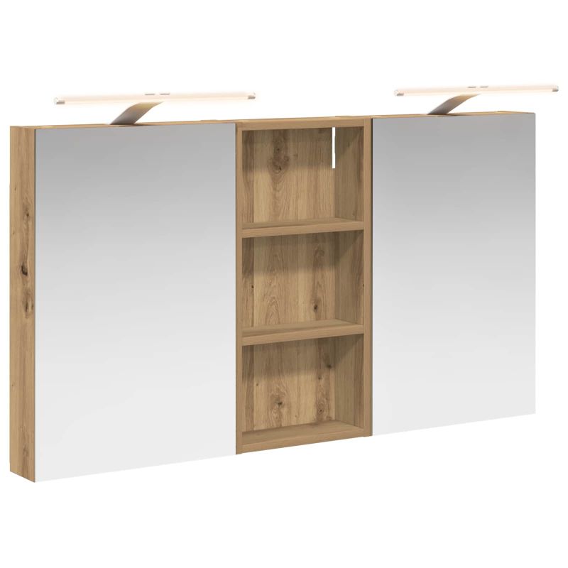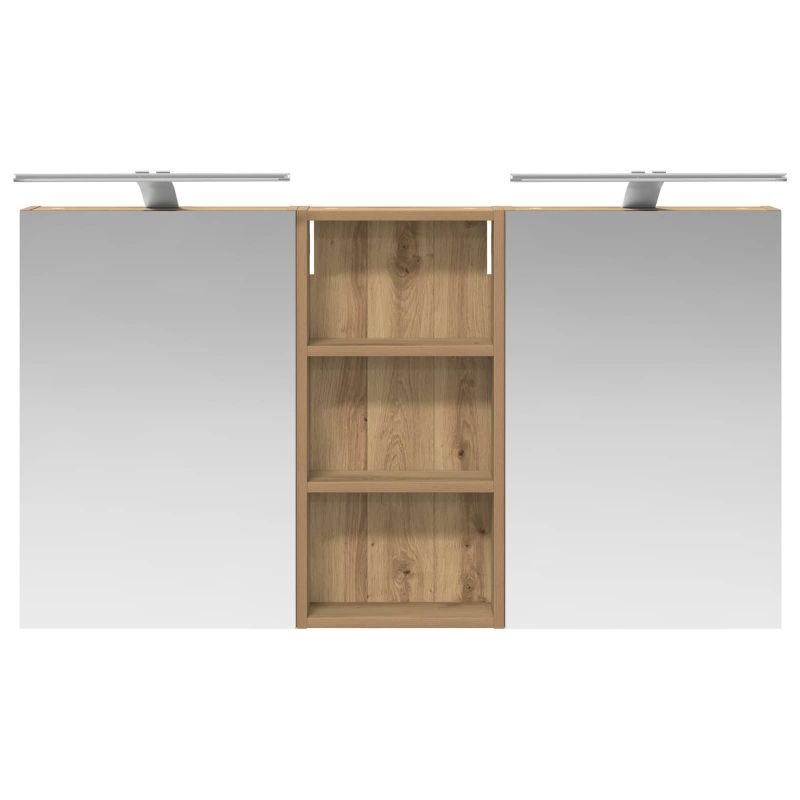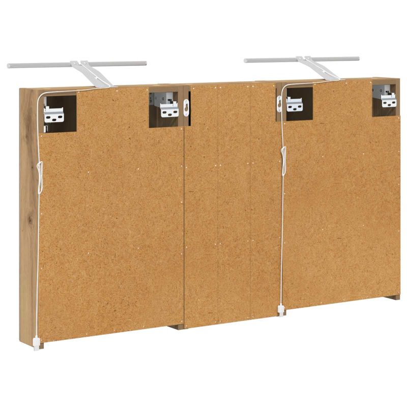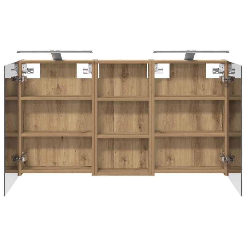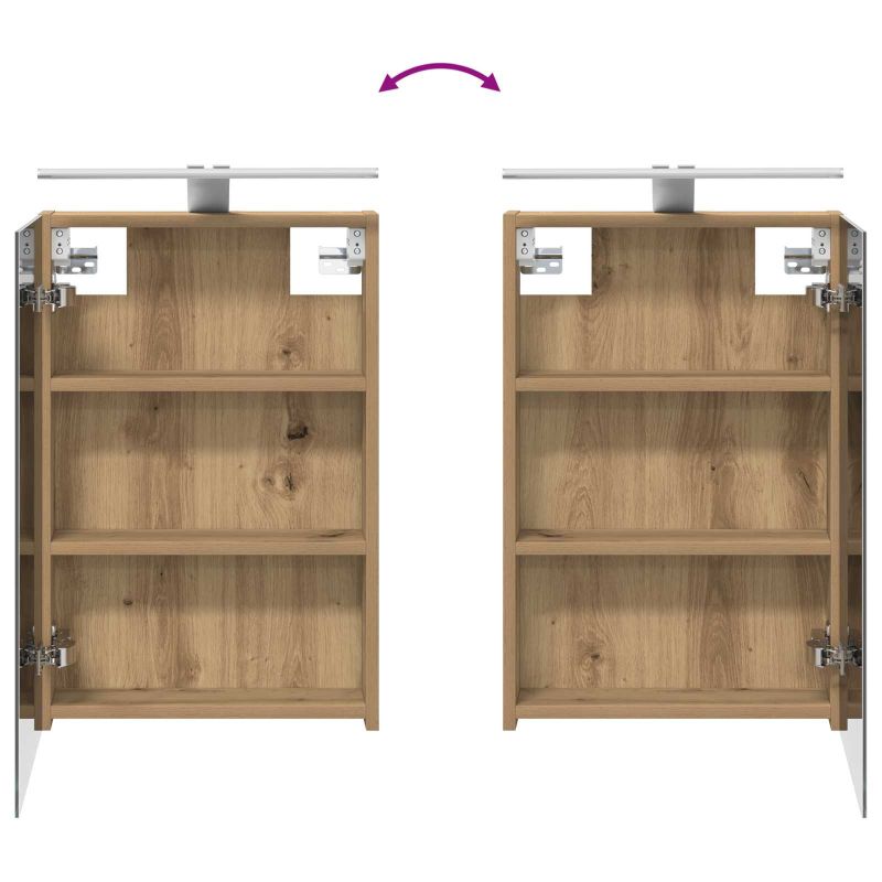 Този модерен банен комплект е олицетворение на стилната изтънченост, съчетавайки атрактивен дизайн с практическа функционалност. Проектиран за съвременния собственик на жилище, той действа както като шкаф за съхранение, така и като стилен акцент, който лесно се вписва в всяка баня. Осигурявайки достатъчно пространство с конфигурацията на стенния си дизайн, той спестява място на пода и позволява лесен достъп до основните неща. Комплектът подобрява атмосферата на банята с двупосочното огледало и LED осветление, създавайки удобна и организирана среда за ежедневните ритуали. Инженерна дървесина: Този шкаф е изработен от инженерна дървесина, позната с отличната си стабилност и издръжливост. Материалът е устойчив на деформация и повреди, осигурявайки дълготрайно парче за ежедневна употреба в банята. Гладкото му покритие придава елегантен вид, който е лесен за поддръжка. Простор за съхранение: Проектиран за максимална полезност, този шкаф предлага голямо пространство с множество рафтове и врати с панти. Добре обмисленото разположение позволява удобно организиране на санитарни принадлежности, осигурявайки всичко на ръка. Икономичният му дизайн повишава функционалността на банята, намалявайки безредиците. Инновативно двупосочно огледало: Тази уникална функция предлага уединение и видимост, а външната страна действа като стандартно огледало, докато вътрешната повърхност позволява дискретно наблюдение. Тази комбинация добавя стил и естетика в съвременните интериори. Ефективно LED осветление: С регулируеми LED ленти, захранвани от USB, шкафът осветява пространството с ярко и енергийно-ефективно осветление, което е особено приятно през нощта. Лесна поддръжка: Поддържането на този шкаф е супер лесно. Препоръчително е да използвате мек плат за почистване, а силните химикали да се избягват, за да се запази целостта на материала. Моля, обърнете внимание, че трябва да използвате само сертифициран вход DC 5V. По-високото напрежение може да доведе до прегряване и да повреди устройството, както и до потенциален риск от прегряване и пожар. Не свързвайте този продукт към захранване, различно от описаното в ръководството, на табелката с името или изрично препоръчано от vidaXL. Този уред не трябва да се използва от деца под 15 години, както и от лица с намалени физически, сетивни или умствени способности или с липса на опит и познания относно използването на електронни уреди. Електричеството е опасно. Повредите и неправилният монтаж, употреба или промяна (подмяна на отделни компоненти) могат да доведат до повреда на уреда , което да доведе до токов удар и опасност за потребителя. Не използвайте този продукт във взривоопасна атмосфера, като например при наличие на запалими течности, газове и прах, или при температура над 50 градуса по Целзий или повече. Не включвайте продукта, ако свързващият кабел или захранването са видимо повредени. Ако външният гъвкав кабел или захранващ кабел на това осветително тяло е повреден, той трябва да бъде заменен изключително от производителя или негов сервизен агент, или от подобно квалифицирано лице, за да се избегне опасност. Изключете захранването по време на монтажа и поддръжката. Уверете се, че крушките са изстинали. Светлинният източник на това осветително тяло не може да се заменя; когато светлинният източник д