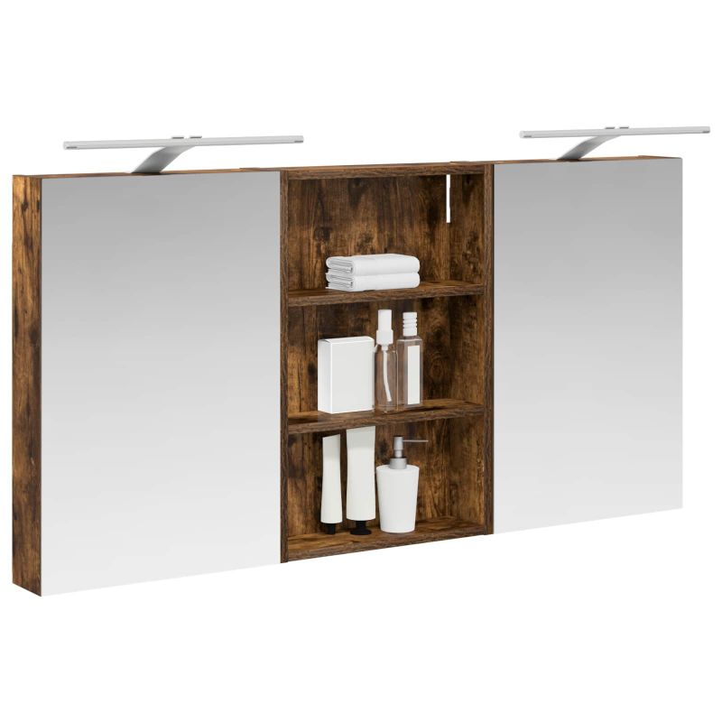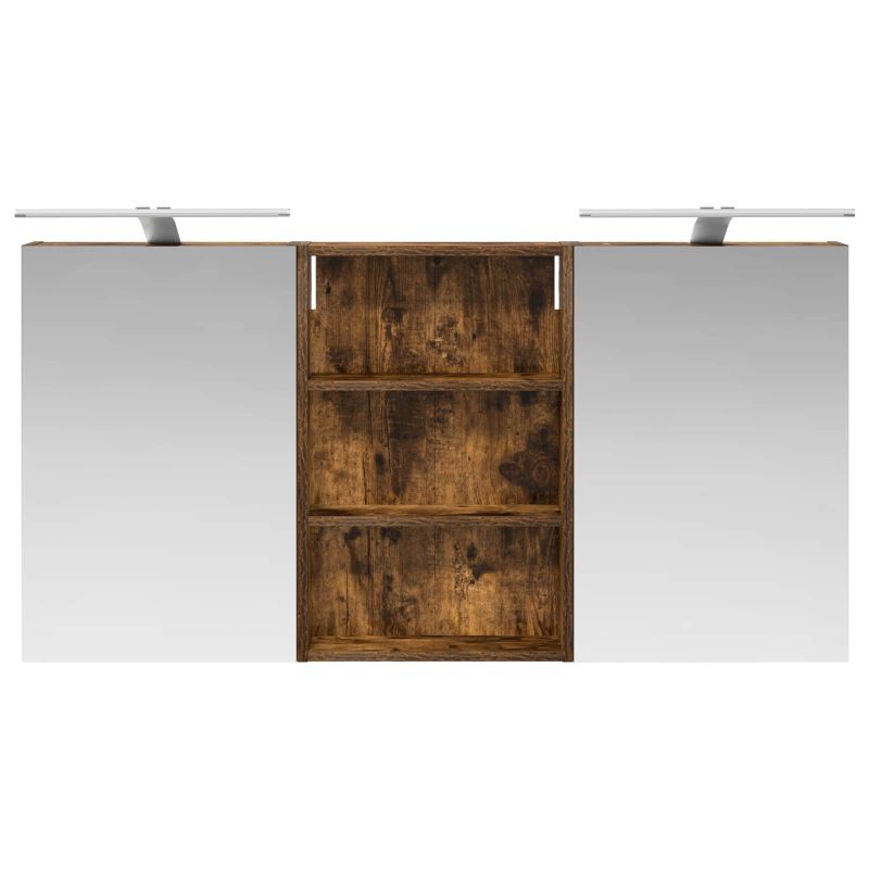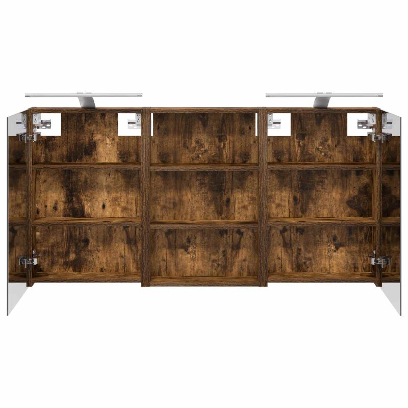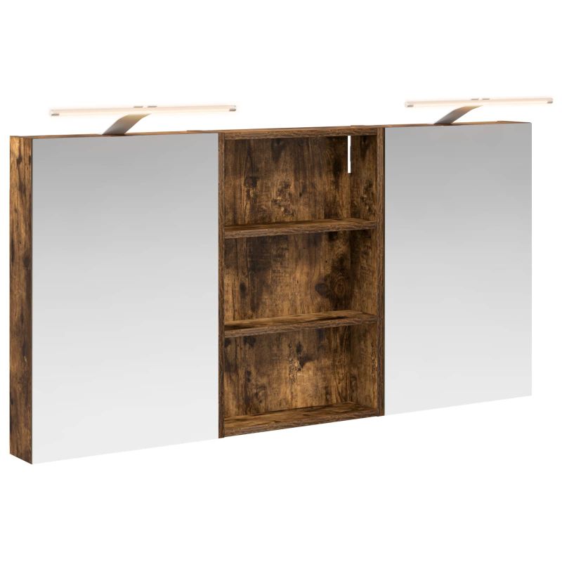 Този модерен банен комплект е олицетворение на стилната изтънченост, съчетавайки атрактивен дизайн с практическа функционалност. Проектиран за съвременния собственик на жилище, той действа както като шкаф за съхранение, така и като стилен акцент, който лесно се вписва в всяка баня. Осигурявайки достатъчно пространство с конфигурацията на стенния си дизайн, той спестява място на пода и позволява лесен достъп до основните неща. Комплектът подобрява атмосферата на банята с двупосочното огледало и LED осветление, създавайки удобна и организирана среда за ежедневните ритуали. Инженерна дървесина: Този шкаф е изработен от инженерна дървесина, позната с отличната си стабилност и издръжливост. Материалът е устойчив на деформация и повреди, осигурявайки дълготрайно парче за ежедневна употреба в банята. Гладкото му покритие придава елегантен вид, който е лесен за поддръжка. Простор за съхранение: Проектиран за максимална полезност, този шкаф предлага голямо пространство с множество рафтове и врати с панти. Добре обмисленото разположение позволява удобно организиране на санитарни принадлежности, осигурявайки всичко на ръка. Икономичният му дизайн повишава функционалността на банята, намалявайки безредиците. Инновативно двупосочно огледало: Тази уникална функция предлага уединение и видимост, а външната страна действа като стандартно огледало, докато вътрешната повърхност позволява дискретно наблюдение. Тази комбинация добавя стил и естетика в съвременните интериори. Ефективно LED осветление: С регулируеми LED ленти, захранвани от USB, шкафът осветява пространството с ярко и енергийно-ефективно осветление, което е особено приятно през нощта. Лесна поддръжка: Поддържането на този шкаф е супер лесно. Препоръчително е да използвате мек плат за почистване, а силните химикали да се избягват, за да се запази целостта на материала. Моля, обърнете внимание, че трябва да използвате само сертифициран вход DC 5V. По-високото напрежение може да доведе до прегряване и да повреди устройството, както и до потенциален риск от прегряване и пожар. Не свързвайте този продукт към захранване, различно от описаното в ръководството, на табелката с името или изрично препоръчано от vidaXL. Този уред не трябва да се използва от деца под 15 години, както и от лица с намалени физически, сетивни или умствени способности или с липса на опит и познания относно използването на електронни уреди. Електричеството е опасно. Повредите и неправилният монтаж, употреба или промяна (подмяна на отделни компоненти) могат да доведат до повреда на уреда , което да доведе до токов удар и опасност за потребителя. Не използвайте този продукт във взривоопасна атмосфера, като например при наличие на запалими течности, газове и прах, или при температура над 50 градуса по Целзий или повече. Не включвайте продукта, ако свързващият кабел или захранването са видимо повредени. Ако външният гъвкав кабел или захранващ кабел на това осветително тяло е повреден, той трябва да бъде заменен изключително от производителя или негов сервизен агент, или от подобно квалифицирано лице, за да се избегне опасност. Изключете захранването по време на монтажа и поддръжката. Уверете се, че крушките са изстинали. Светлинният източник на това осветително тяло не може да се заменя; когато светлинният източник д