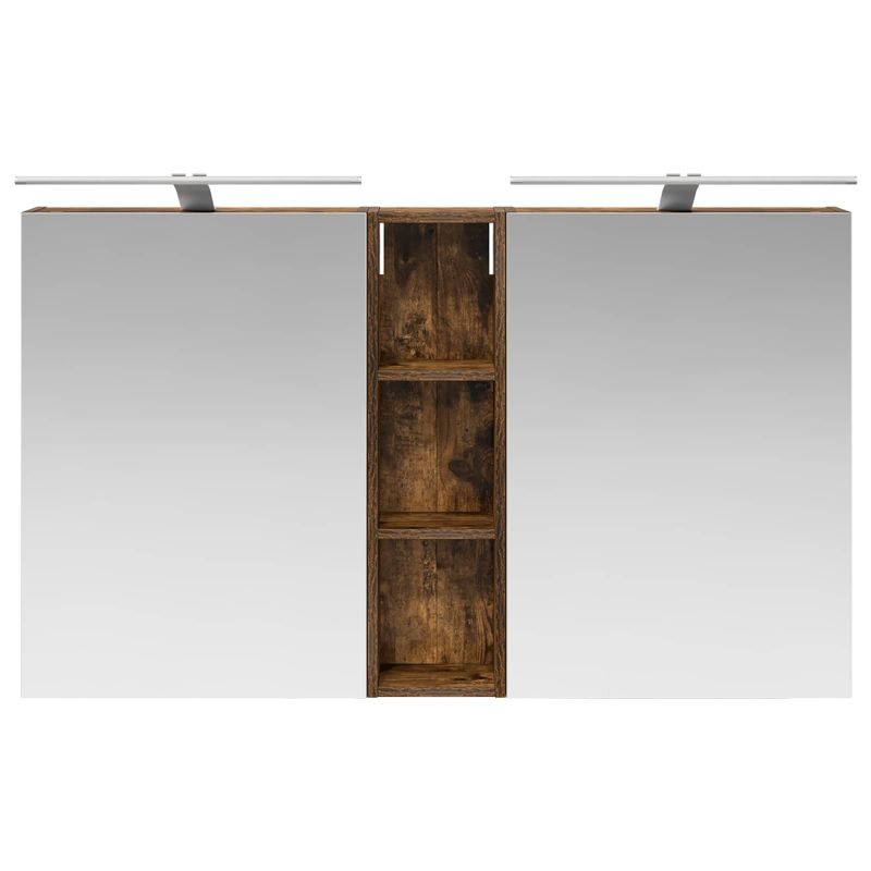 Този модерен банен комплект е олицетворение на стилната изтънченост, съчетавайки атрактивен дизайн с практическа функционалност. Проектиран за съвременния собственик на жилище, той действа както като шкаф за съхранение, така и като стилен акцент, който лесно се вписва в всяка баня. Осигурявайки достатъчно пространство с конфигурацията на стенния си дизайн, той спестява място на пода и позволява лесен достъп до основните неща. Комплектът подобрява атмосферата на банята с двупосочното огледало и LED осветление, създавайки удобна и организирана среда за ежедневните ритуали. Инженерна дървесина: Този шкаф е изработен от инженерна дървесина, позната с отличната си стабилност и издръжливост. Материалът е устойчив на деформация и повреди, осигурявайки дълготрайно парче за ежедневна употреба в банята. Гладкото му покритие придава елегантен вид, който е лесен за поддръжка. Простор за съхранение: Проектиран за максимална полезност, този шкаф предлага голямо пространство с множество рафтове и врати с панти. Добре обмисленото разположение позволява удобно организиране на санитарни принадлежности, осигурявайки всичко на ръка. Икономичният му дизайн повишава функционалността на банята, намалявайки безредиците. Инновативно двупосочно огледало: Тази уникална функция предлага уединение и видимост, а външната страна действа като стандартно огледало, докато вътрешната повърхност позволява дискретно наблюдение. Тази комбинация добавя стил и естетика в съвременните интериори. Ефективно LED осветление: С регулируеми LED ленти, захранвани от USB, шкафът осветява пространството с ярко и енергийно-ефективно осветление, което е особено приятно през нощта. Лесна поддръжка: Поддържането на този шкаф е супер лесно. Препоръчително е да използвате мек плат за почистване, а силните химикали да се избягват, за да се запази целостта на материала. Моля, обърнете внимание, че трябва да използвате само сертифициран вход DC 5V. По-високото напрежение може да доведе до прегряване и да повреди устройството, както и до потенциален риск от прегряване и пожар. Не свързвайте този продукт към захранване, различно от описаното в ръководството, на табелката с името или изрично препоръчано от vidaXL. Този уред не трябва да се използва от деца под 15 години, както и от лица с намалени физически, сетивни или умствени способности или с липса на опит и познания относно използването на електронни уреди. Електричеството е опасно. Повредите и неправилният монтаж, употреба или промяна (подмяна на отделни компоненти) могат да доведат до повреда на уреда , което да доведе до токов удар и опасност за потребителя. Не използвайте този продукт във взривоопасна атмосфера, като например при наличие на запалими течности, газове и прах, или при температура над 50 градуса по Целзий или повече. Не включвайте продукта, ако свързващият кабел или захранването са видимо повредени. Ако външният гъвкав кабел или захранващ кабел на това осветително тяло е повреден, той трябва да бъде заменен изключително от производителя или негов сервизен агент, или от подобно квалифицирано лице, за да се избегне опасност. Изключете захранването по време на монтажа и поддръжката. Уверете се, че крушките са изстинали. Светлинният източник на това осветително тяло не може да се заменя; когато светлинният източник д