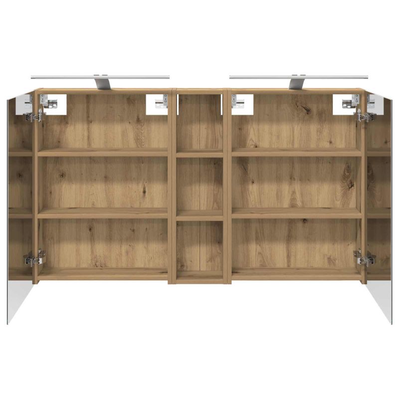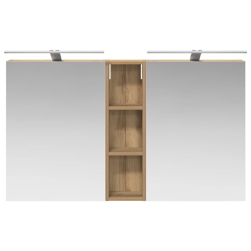 Този модерен банен комплект е олицетворение на стилната изтънченост, съчетавайки атрактивен дизайн с практическа функционалност. Проектиран за съвременния собственик на жилище, той действа както като шкаф за съхранение, така и като стилен акцент, който лесно се вписва в всяка баня. Осигурявайки достатъчно пространство с конфигурацията на стенния си дизайн, той спестява място на пода и позволява лесен достъп до основните неща. Комплектът подобрява атмосферата на банята с двупосочното огледало и LED осветление, създавайки удобна и организирана среда за ежедневните ритуали. Инженерна дървесина: Този шкаф е изработен от инженерна дървесина, позната с отличната си стабилност и издръжливост. Материалът е устойчив на деформация и повреди, осигурявайки дълготрайно парче за ежедневна употреба в банята. Гладкото му покритие придава елегантен вид, който е лесен за поддръжка. Простор за съхранение: Проектиран за максимална полезност, този шкаф предлага голямо пространство с множество рафтове и врати с панти. Добре обмисленото разположение позволява удобно организиране на санитарни принадлежности, осигурявайки всичко на ръка. Икономичният му дизайн повишава функционалността на банята, намалявайки безредиците. Инновативно двупосочно огледало: Тази уникална функция предлага уединение и видимост, а външната страна действа като стандартно огледало, докато вътрешната повърхност позволява дискретно наблюдение. Тази комбинация добавя стил и естетика в съвременните интериори. Ефективно LED осветление: С регулируеми LED ленти, захранвани от USB, шкафът осветява пространството с ярко и енергийно-ефективно осветление, което е особено приятно през нощта. Лесна поддръжка: Поддържането на този шкаф е супер лесно. Препоръчително е да използвате мек плат за почистване, а силните химикали да се избягват, за да се запази целостта на материала. Моля, обърнете внимание, че трябва да използвате само сертифициран вход DC 5V. По-високото напрежение може да доведе до прегряване и да повреди устройството, както и до потенциален риск от прегряване и пожар. Не свързвайте този продукт към захранване, различно от описаното в ръководството, на табелката с името или изрично препоръчано от vidaXL. Този уред не трябва да се използва от деца под 15 години, както и от лица с намалени физически, сетивни или умствени способности или с липса на опит и познания относно използването на електронни уреди. Електричеството е опасно. Повредите и неправилният монтаж, употреба или промяна (подмяна на отделни компоненти) могат да доведат до повреда на уреда , което да доведе до токов удар и опасност за потребителя. Не използвайте този продукт във взривоопасна атмосфера, като например при наличие на запалими течности, газове и прах, или при температура над 50 градуса по Целзий или повече. Не включвайте продукта, ако свързващият кабел или захранването са видимо повредени. Ако външният гъвкав кабел или захранващ кабел на това осветително тяло е повреден, той трябва да бъде заменен изключително от производителя или негов сервизен агент, или от подобно квалифицирано лице, за да се избегне опасност. Изключете захранването по време на монтажа и поддръжката. Уверете се, че крушките са изстинали. Светлинният източник на това осветително тяло не може да се заменя; когато светлинният източник д
