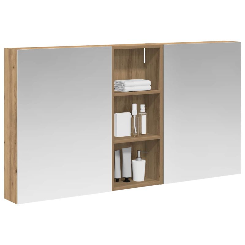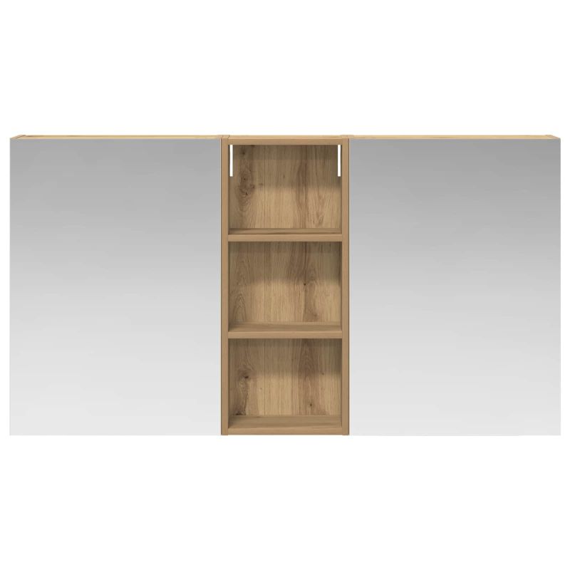 Този модерен банен комплект е олицетворение на стилната изтънченост, съчетавайки атрактивен дизайн с практическа функционалност. Проектиран за съвременния собственик на жилище, той действа както като шкаф за съхранение, така и като стилен акцент, който лесно се вписва в всяка баня. Осигурявайки достатъчно пространство с конфигурацията на стенния си дизайн, той спестява място на пода и позволява лесен достъп до основните неща. Комплектът подобрява атмосферата на банята с двупосочното огледало и LED осветление, създавайки удобна и организирана среда за ежедневните ритуали. Инженерна дървесина: Този шкаф е изработен от инженерна дървесина, позната с отличната си стабилност и издръжливост. Материалът е устойчив на деформация и повреди, осигурявайки дълготрайно парче за ежедневна употреба в банята. Гладкото му покритие придава елегантен вид, който е лесен за поддръжка. Простор за съхранение: Проектиран за максимална полезност, този шкаф предлага голямо пространство с множество рафтове и врати с панти. Добре обмисленото разположение позволява удобно организиране на санитарни принадлежности, осигурявайки всичко на ръка. Икономичният му дизайн повишава функционалността на банята, намалявайки безредиците. Инновативно двупосочно огледало: Тази уникална функция предлага уединение и видимост, а външната страна действа като стандартно огледало, докато вътрешната повърхност позволява дискретно наблюдение. Тази комбинация добавя стил и естетика в съвременните интериори. Ефективно LED осветление: С регулируеми LED ленти, захранвани от USB, шкафът осветява пространството с ярко и енергийно-ефективно осветление, което е особено приятно през нощта. Лесна поддръжка: Поддържането на този шкаф е супер лесно. Препоръчително е да използвате мек плат за почистване, а силните химикали да се избягват, за да се запази целостта на материала.