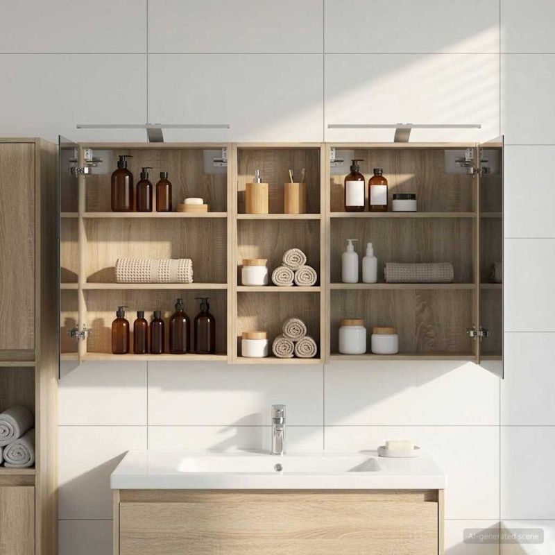 Този модерен банен комплект е олицетворение на стилната изтънченост, съчетавайки атрактивен дизайн с практическа функционалност. Проектиран за съвременния собственик на жилище, той действа както като шкаф за съхранение, така и като стилен акцент, който лесно се вписва в всяка баня. Осигурявайки достатъчно пространство с конфигурацията на стенния си дизайн, той спестява място на пода и позволява лесен достъп до основните неща. Комплектът подобрява атмосферата на банята с двупосочното огледало и LED осветление, създавайки удобна и организирана среда за ежедневните ритуали. Инженерна дървесина: Този шкаф е изработен от инженерна дървесина, позната с отличната си стабилност и издръжливост. Материалът е устойчив на деформация и повреди, осигурявайки дълготрайно парче за ежедневна употреба в банята. Гладкото му покритие придава елегантен вид, който е лесен за поддръжка. Простор за съхранение: Проектиран за максимална полезност, този шкаф предлага голямо пространство с множество рафтове и врати с панти. Добре обмисленото разположение позволява удобно организиране на санитарни принадлежности, осигурявайки всичко на ръка. Икономичният му дизайн повишава функционалността на банята, намалявайки безредиците. Инновативно двупосочно огледало: Тази уникална функция предлага уединение и видимост, а външната страна действа като стандартно огледало, докато вътрешната повърхност позволява дискретно наблюдение. Тази комбинация добавя стил и естетика в съвременните интериори. Ефективно LED осветление: С регулируеми LED ленти, захранвани от USB, шкафът осветява пространството с ярко и енергийно-ефективно осветление, което е особено приятно през нощта. Лесна поддръжка: Поддържането на този шкаф е супер лесно. Препоръчително е да използвате мек плат за почистване, а силните химикали да се избягват, за да се запази целостта на материала.