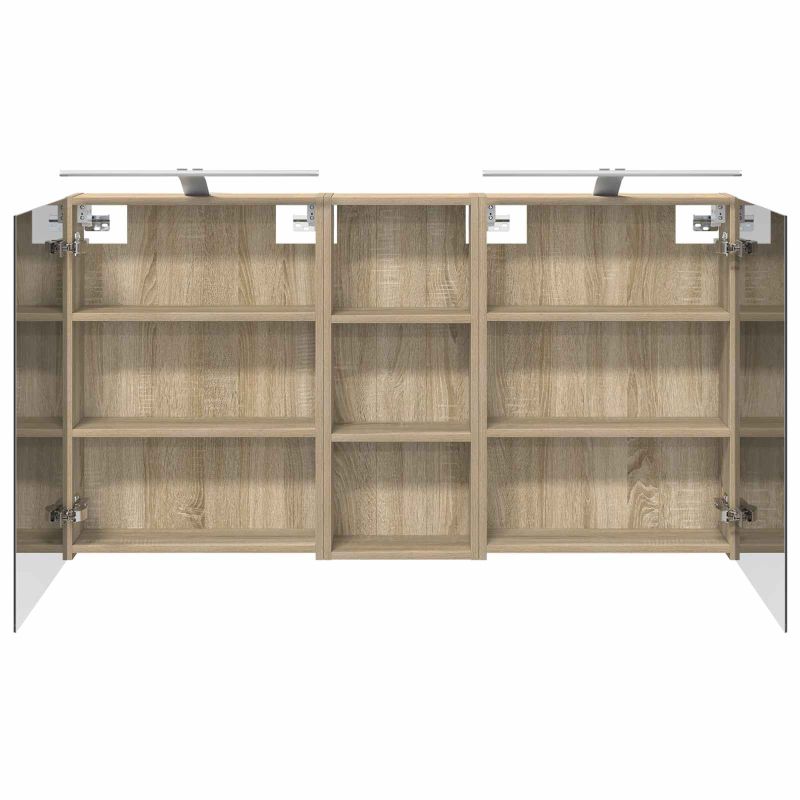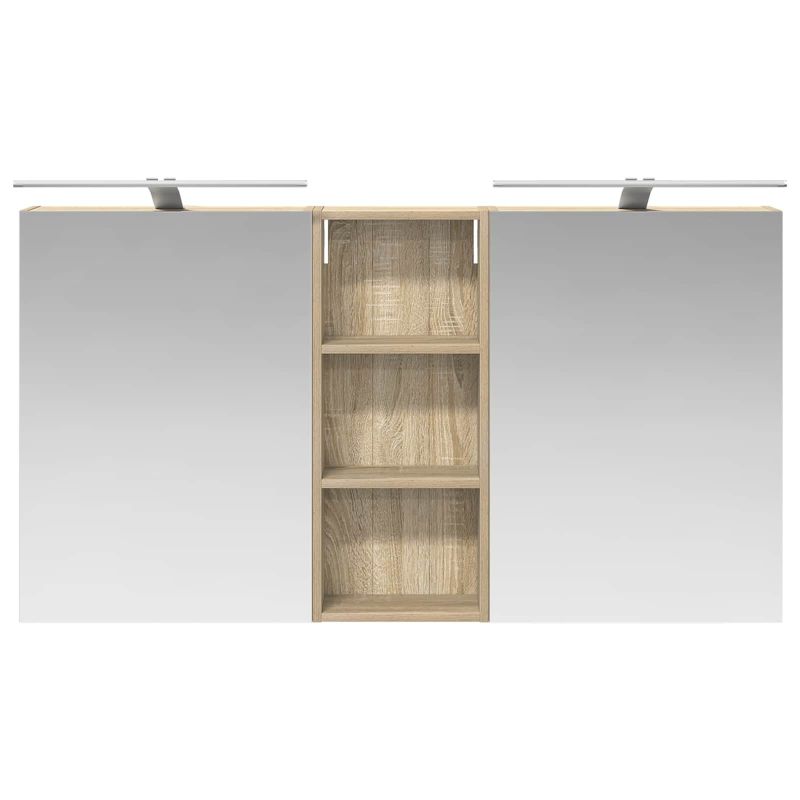 Този модерен банен комплект е олицетворение на стилната изтънченост, съчетавайки атрактивен дизайн с практическа функционалност. Проектиран за съвременния собственик на жилище, той действа както като шкаф за съхранение, така и като стилен акцент, който лесно се вписва в всяка баня. Осигурявайки достатъчно пространство с конфигурацията на стенния си дизайн, той спестява място на пода и позволява лесен достъп до основните неща. Комплектът подобрява атмосферата на банята с двупосочното огледало и LED осветление, създавайки удобна и организирана среда за ежедневните ритуали. Инженерна дървесина: Този шкаф е изработен от инженерна дървесина, позната с отличната си стабилност и издръжливост. Материалът е устойчив на деформация и повреди, осигурявайки дълготрайно парче за ежедневна употреба в банята. Гладкото му покритие придава елегантен вид, който е лесен за поддръжка. Простор за съхранение: Проектиран за максимална полезност, този шкаф предлага голямо пространство с множество рафтове и врати с панти. Добре обмисленото разположение позволява удобно организиране на санитарни принадлежности, осигурявайки всичко на ръка. Икономичният му дизайн повишава функционалността на банята, намалявайки безредиците. Инновативно двупосочно огледало: Тази уникална функция предлага уединение и видимост, а външната страна действа като стандартно огледало, докато вътрешната повърхност позволява дискретно наблюдение. Тази комбинация добавя стил и естетика в съвременните интериори. Ефективно LED осветление: С регулируеми LED ленти, захранвани от USB, шкафът осветява пространството с ярко и енергийно-ефективно осветление, което е особено приятно през нощта. Лесна поддръжка: Поддържането на този шкаф е супер лесно. Препоръчително е да използвате мек плат за почистване, а силните химикали да се избягват, за да се запази целостта на материала. Моля, обърнете внимание, че трябва да използвате само сертифициран вход DC 5V. По-високото напрежение може да доведе до прегряване и да повреди устройството, както и до потенциален риск от прегряване и пожар. Не свързвайте този продукт към захранване, различно от описаното в ръководството, на табелката с името или изрично препоръчано от vidaXL. Този уред не трябва да се използва от деца под 15 години, както и от лица с намалени физически, сетивни или умствени способности или с липса на опит и познания относно използването на електронни уреди. Електричеството е опасно. Повредите и неправилният монтаж, употреба или промяна (подмяна на отделни компоненти) могат да доведат до повреда на уреда , което да доведе до токов удар и опасност за потребителя. Не използвайте този продукт във взривоопасна атмосфера, като например при наличие на запалими течности, газове и прах, или при температура над 50 градуса по Целзий или повече. Не включвайте продукта, ако свързващият кабел или захранването са видимо повредени. Ако външният гъвкав кабел или захранващ кабел на това осветително тяло е повреден, той трябва да бъде заменен изключително от производителя или негов сервизен агент, или от подобно квалифицирано лице, за да се избегне опасност. Изключете захранването по време на монтажа и поддръжката. Уверете се, че крушките са изстинали. Светлинният източник на това осветително тяло не може да се заменя; когато светлинният източник д