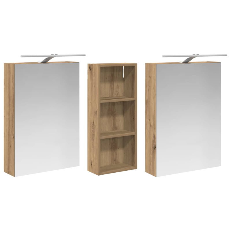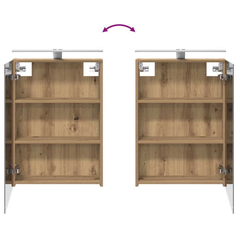 Този модерен банен комплект е олицетворение на стилната изтънченост, съчетавайки атрактивен дизайн с практическа функционалност. Проектиран за съвременния собственик на жилище, той действа както като шкаф за съхранение, така и като стилен акцент, който лесно се вписва в всяка баня. Осигурявайки достатъчно пространство с конфигурацията на стенния си дизайн, той спестява място на пода и позволява лесен достъп до основните неща. Комплектът подобрява атмосферата на банята с двупосочното огледало и LED осветление, създавайки удобна и организирана среда за ежедневните ритуали. Инженерна дървесина: Този шкаф е изработен от инженерна дървесина, позната с отличната си стабилност и издръжливост. Материалът е устойчив на деформация и повреди, осигурявайки дълготрайно парче за ежедневна употреба в банята. Гладкото му покритие придава елегантен вид, който е лесен за поддръжка. Простор за съхранение: Проектиран за максимална полезност, този шкаф предлага голямо пространство с множество рафтове и врати с панти. Добре обмисленото разположение позволява удобно организиране на санитарни принадлежности, осигурявайки всичко на ръка. Икономичният му дизайн повишава функционалността на банята, намалявайки безредиците. Инновативно двупосочно огледало: Тази уникална функция предлага уединение и видимост, а външната страна действа като стандартно огледало, докато вътрешната повърхност позволява дискретно наблюдение. Тази комбинация добавя стил и естетика в съвременните интериори. Ефективно LED осветление: С регулируеми LED ленти, захранвани от USB, шкафът осветява пространството с ярко и енергийно-ефективно осветление, което е особено приятно през нощта. Лесна поддръжка: Поддържането на този шкаф е супер лесно. Препоръчително е да използвате мек плат за почистване, а силните химикали да се избягват, за да се запази целостта на материала. Моля, обърнете внимание, че трябва да използвате само сертифициран вход DC 5V. По-високото напрежение може да доведе до прегряване и да повреди устройството, както и до потенциален риск от прегряване и пожар. Не свързвайте този продукт към захранване, различно от описаното в ръководството, на табелката с името или изрично препоръчано от vidaXL. Този уред не трябва да се използва от деца под 15 години, както и от лица с намалени физически, сетивни или умствени способности или с липса на опит и познания относно използването на електронни уреди. Електричеството е опасно. Повредите и неправилният монтаж, употреба или промяна (подмяна на отделни компоненти) могат да доведат до повреда на уреда , което да доведе до токов удар и опасност за потребителя. Не използвайте този продукт във взривоопасна атмосфера, като например при наличие на запалими течности, газове и прах, или при температура над 50 градуса по Целзий или повече. Не включвайте продукта, ако свързващият кабел или захранването са видимо повредени. Ако външният гъвкав кабел или захранващ кабел на това осветително тяло е повреден, той трябва да бъде заменен изключително от производителя или негов сервизен агент, или от подобно квалифицирано лице, за да се избегне опасност. Изключете захранването по време на монтажа и поддръжката. Уверете се, че крушките са изстинали. Светлинният източник на това осветително тяло не може да се заменя; когато светлинният източник д