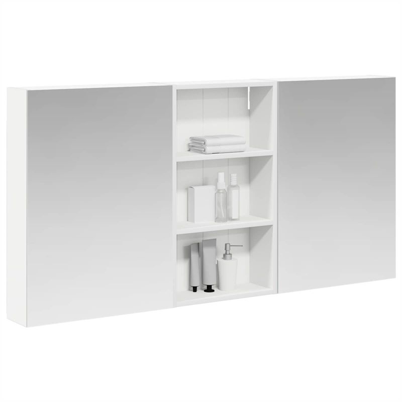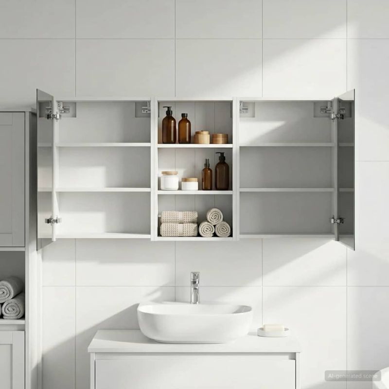 Този модерен банен комплект е олицетворение на стилната изтънченост, съчетавайки атрактивен дизайн с практическа функционалност. Проектиран за съвременния собственик на жилище, той действа както като шкаф за съхранение, така и като стилен акцент, който лесно се вписва в всяка баня. Осигурявайки достатъчно пространство с конфигурацията на стенния си дизайн, той спестява място на пода и позволява лесен достъп до основните неща. Комплектът подобрява атмосферата на банята с двупосочното огледало и LED осветление, създавайки удобна и организирана среда за ежедневните ритуали. Инженерна дървесина: Този шкаф е изработен от инженерна дървесина, позната с отличната си стабилност и издръжливост. Материалът е устойчив на деформация и повреди, осигурявайки дълготрайно парче за ежедневна употреба в банята. Гладкото му покритие придава елегантен вид, който е лесен за поддръжка. Простор за съхранение: Проектиран за максимална полезност, този шкаф предлага голямо пространство с множество рафтове и врати с панти. Добре обмисленото разположение позволява удобно организиране на санитарни принадлежности, осигурявайки всичко на ръка. Икономичният му дизайн повишава функционалността на банята, намалявайки безредиците. Инновативно двупосочно огледало: Тази уникална функция предлага уединение и видимост, а външната страна действа като стандартно огледало, докато вътрешната повърхност позволява дискретно наблюдение. Тази комбинация добавя стил и естетика в съвременните интериори. Ефективно LED осветление: С регулируеми LED ленти, захранвани от USB, шкафът осветява пространството с ярко и енергийно-ефективно осветление, което е особено приятно през нощта. Лесна поддръжка: Поддържането на този шкаф е супер лесно. Препоръчително е да използвате мек плат за почистване, а силните химикали да се избягват, за да се запази целостта на материала.
