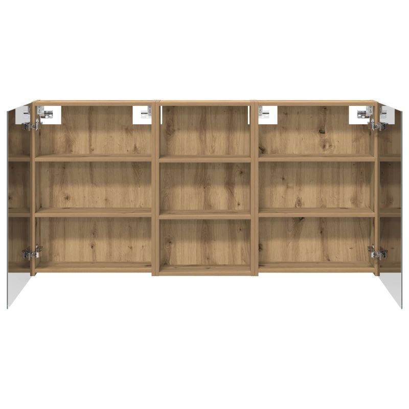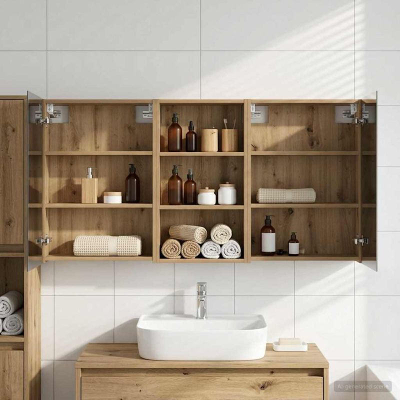 Този модерен банен комплект е олицетворение на стилната изтънченост, съчетавайки атрактивен дизайн с практическа функционалност. Проектиран за съвременния собственик на жилище, той действа както като шкаф за съхранение, така и като стилен акцент, който лесно се вписва в всяка баня. Осигурявайки достатъчно пространство с конфигурацията на стенния си дизайн, той спестява място на пода и позволява лесен достъп до основните неща. Комплектът подобрява атмосферата на банята с двупосочното огледало и LED осветление, създавайки удобна и организирана среда за ежедневните ритуали. Инженерна дървесина: Този шкаф е изработен от инженерна дървесина, позната с отличната си стабилност и издръжливост. Материалът е устойчив на деформация и повреди, осигурявайки дълготрайно парче за ежедневна употреба в банята. Гладкото му покритие придава елегантен вид, който е лесен за поддръжка. Простор за съхранение: Проектиран за максимална полезност, този шкаф предлага голямо пространство с множество рафтове и врати с панти. Добре обмисленото разположение позволява удобно организиране на санитарни принадлежности, осигурявайки всичко на ръка. Икономичният му дизайн повишава функционалността на банята, намалявайки безредиците. Инновативно двупосочно огледало: Тази уникална функция предлага уединение и видимост, а външната страна действа като стандартно огледало, докато вътрешната повърхност позволява дискретно наблюдение. Тази комбинация добавя стил и естетика в съвременните интериори. Ефективно LED осветление: С регулируеми LED ленти, захранвани от USB, шкафът осветява пространството с ярко и енергийно-ефективно осветление, което е особено приятно през нощта. Лесна поддръжка: Поддържането на този шкаф е супер лесно. Препоръчително е да използвате мек плат за почистване, а силните химикали да се избягват, за да се запази целостта на материала.