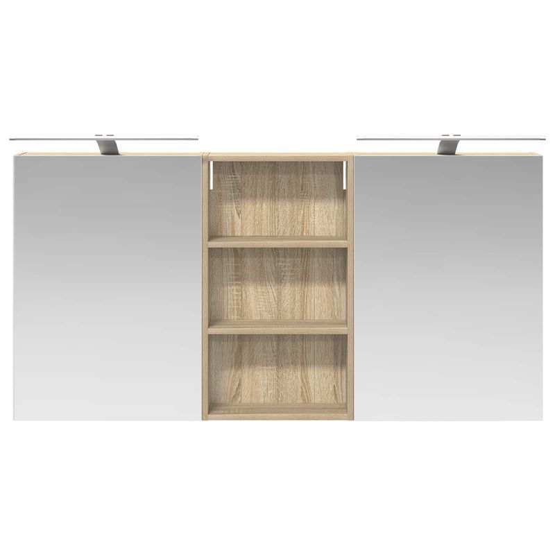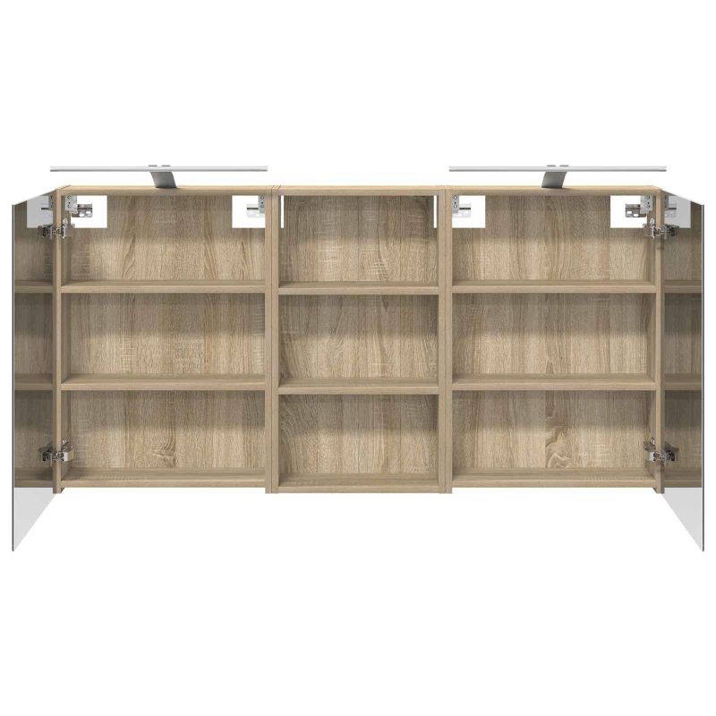 Този модерен банен комплект е олицетворение на стилната изтънченост, съчетавайки атрактивен дизайн с практическа функционалност. Проектиран за съвременния собственик на жилище, той действа както като шкаф за съхранение, така и като стилен акцент, който лесно се вписва в всяка баня. Осигурявайки достатъчно пространство с конфигурацията на стенния си дизайн, той спестява място на пода и позволява лесен достъп до основните неща. Комплектът подобрява атмосферата на банята с двупосочното огледало и LED осветление, създавайки удобна и организирана среда за ежедневните ритуали. Инженерна дървесина: Този шкаф е изработен от инженерна дървесина, позната с отличната си стабилност и издръжливост. Материалът е устойчив на деформация и повреди, осигурявайки дълготрайно парче за ежедневна употреба в банята. Гладкото му покритие придава елегантен вид, който е лесен за поддръжка. Простор за съхранение: Проектиран за максимална полезност, този шкаф предлага голямо пространство с множество рафтове и врати с панти. Добре обмисленото разположение позволява удобно организиране на санитарни принадлежности, осигурявайки всичко на ръка. Икономичният му дизайн повишава функционалността на банята, намалявайки безредиците. Инновативно двупосочно огледало: Тази уникална функция предлага уединение и видимост, а външната страна действа като стандартно огледало, докато вътрешната повърхност позволява дискретно наблюдение. Тази комбинация добавя стил и естетика в съвременните интериори. Ефективно LED осветление: С регулируеми LED ленти, захранвани от USB, шкафът осветява пространството с ярко и енергийно-ефективно осветление, което е особено приятно през нощта. Лесна поддръжка: Поддържането на този шкаф е супер лесно. Препоръчително е да използвате мек плат за почистване, а силните химикали да се избягват, за да се запази целостта на материала. Моля, обърнете внимание, че трябва да използвате само сертифициран вход DC 5V. По-високото напрежение може да доведе до прегряване и да повреди устройството, както и до потенциален риск от прегряване и пожар. Не свързвайте този продукт към захранване, различно от описаното в ръководството, на табелката с името или изрично препоръчано от vidaXL. Този уред не трябва да се използва от деца под 15 години, както и от лица с намалени физически, сетивни или умствени способности или с липса на опит и познания относно използването на електронни уреди. Електричеството е опасно. Повредите и неправилният монтаж, употреба или промяна (подмяна на отделни компоненти) могат да доведат до повреда на уреда , което да доведе до токов удар и опасност за потребителя. Не използвайте този продукт във взривоопасна атмосфера, като например при наличие на запалими течности, газове и прах, или при температура над 50 градуса по Целзий или повече. Не включвайте продукта, ако свързващият кабел или захранването са видимо повредени. Ако външният гъвкав кабел или захранващ кабел на това осветително тяло е повреден, той трябва да бъде заменен изключително от производителя или негов сервизен агент, или от подобно квалифицирано лице, за да се избегне опасност. Изключете захранването по време на монтажа и поддръжката. Уверете се, че крушките са изстинали. Светлинният източник на това осветително тяло не може да се заменя; когато светлинният източник д
