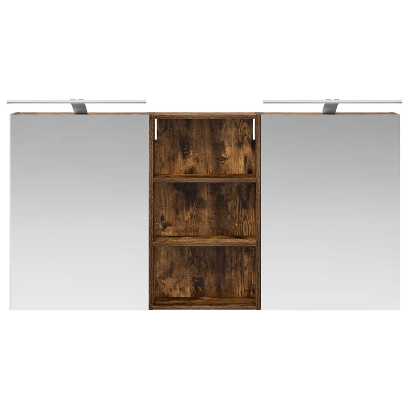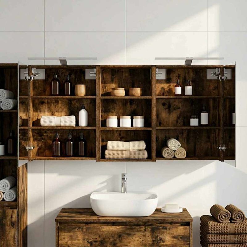 Този модерен банен комплект е олицетворение на стилната изтънченост, съчетавайки атрактивен дизайн с практическа функционалност. Проектиран за съвременния собственик на жилище, той действа както като шкаф за съхранение, така и като стилен акцент, който лесно се вписва в всяка баня. Осигурявайки достатъчно пространство с конфигурацията на стенния си дизайн, той спестява място на пода и позволява лесен достъп до основните неща. Комплектът подобрява атмосферата на банята с двупосочното огледало и LED осветление, създавайки удобна и организирана среда за ежедневните ритуали. Инженерна дървесина: Този шкаф е изработен от инженерна дървесина, позната с отличната си стабилност и издръжливост. Материалът е устойчив на деформация и повреди, осигурявайки дълготрайно парче за ежедневна употреба в банята. Гладкото му покритие придава елегантен вид, който е лесен за поддръжка. Простор за съхранение: Проектиран за максимална полезност, този шкаф предлага голямо пространство с множество рафтове и врати с панти. Добре обмисленото разположение позволява удобно организиране на санитарни принадлежности, осигурявайки всичко на ръка. Икономичният му дизайн повишава функционалността на банята, намалявайки безредиците. Инновативно двупосочно огледало: Тази уникална функция предлага уединение и видимост, а външната страна действа като стандартно огледало, докато вътрешната повърхност позволява дискретно наблюдение. Тази комбинация добавя стил и естетика в съвременните интериори. Ефективно LED осветление: С регулируеми LED ленти, захранвани от USB, шкафът осветява пространството с ярко и енергийно-ефективно осветление, което е особено приятно през нощта. Лесна поддръжка: Поддържането на този шкаф е супер лесно. Препоръчително е да използвате мек плат за почистване, а силните химикали да се избягват, за да се запази целостта на материала. Моля, обърнете внимание, че трябва да използвате само сертифициран вход DC 5V. По-високото напрежение може да доведе до прегряване и да повреди устройството, както и до потенциален риск от прегряване и пожар. Не свързвайте този продукт към захранване, различно от описаното в ръководството, на табелката с името или изрично препоръчано от vidaXL. Този уред не трябва да се използва от деца под 15 години, както и от лица с намалени физически, сетивни или умствени способности или с липса на опит и познания относно използването на електронни уреди. Електричеството е опасно. Повредите и неправилният монтаж, употреба или промяна (подмяна на отделни компоненти) могат да доведат до повреда на уреда , което да доведе до токов удар и опасност за потребителя. Не използвайте този продукт във взривоопасна атмосфера, като например при наличие на запалими течности, газове и прах, или при температура над 50 градуса по Целзий или повече. Не включвайте продукта, ако свързващият кабел или захранването са видимо повредени. Ако външният гъвкав кабел или захранващ кабел на това осветително тяло е повреден, той трябва да бъде заменен изключително от производителя или негов сервизен агент, или от подобно квалифицирано лице, за да се избегне опасност. Изключете захранването по време на монтажа и поддръжката. Уверете се, че крушките са изстинали. Светлинният източник на това осветително тяло не може да се заменя; когато светлинният източник д