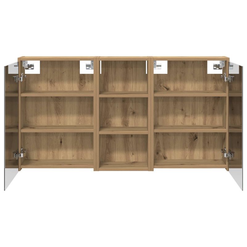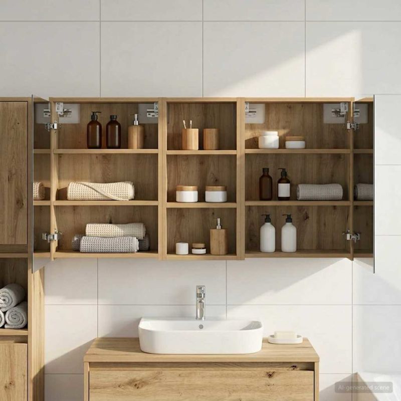 Този комплект шкафове за баня предлага стилно и практично решение за съвременни бани. С инженерна дървесина и елегантни линии, шкафът разполага с огледало, което не само увеличава визуално пространството, но и добавя интрига и многофункционалност. Идеален е за собственици на жилища и дизайнери, предоставя ефективно съхраняване и подобрява визията на банята. Минималистичният дизайн и LED осветлението го правят перфектната комбинация от форма и функция. Конструкция от инженерна дървесина: Този шкаф е здрав и издържлив, запазвайки красивия си вид дори при променящи се условия. Материалът е гладък, лесен за почистване и устойчив на износване. Двойно функционални врати: Стъклените врати са елегантни и удобни, разкривайки огромни отделения за съхранение на лични неща и основни принадлежности за банята. Те минимализират безредиците и максимизират организацията. Инновационно осветление: LED лентите осигуряват оптимално осветление за грижа за косата и подобряват атмосферата в банята. Захранвани с USB, те трансформират шкафа в нещо повече от просто място за съхранение. Двупосочно огледало: Уникално проектирано, огледалото добавя дълбочина на шкафа и е идеално за бани, които се нуждаят от частност. Лесен монтаж на стена: Проектирано е за съвременни жилища и може да се монтира на стена, освобождавайки ценна подова площ.