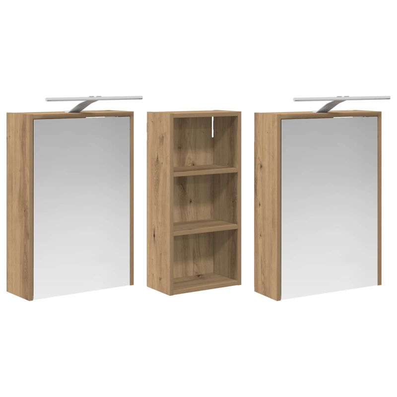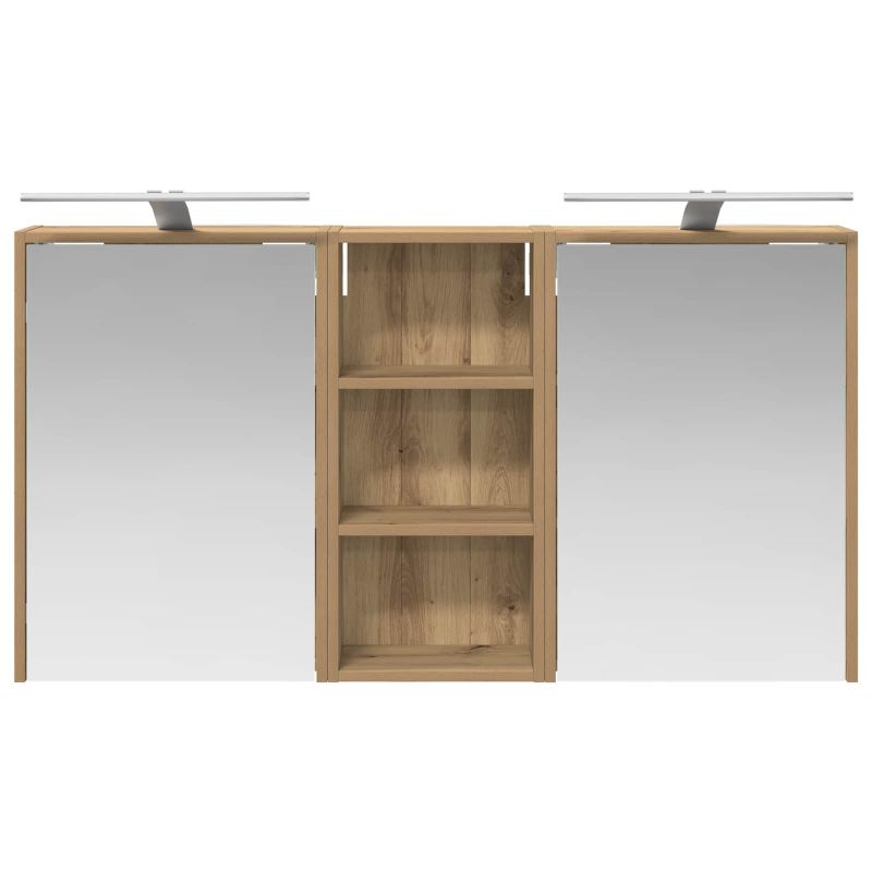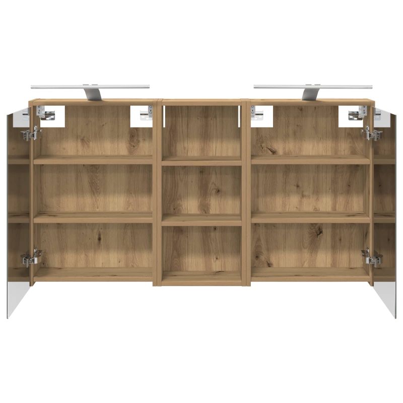 Този комплект шкафове за баня предлага стилно и практично решение за съвременни бани. С инженерна дървесина и елегантни линии, шкафът разполага с огледало, което не само увеличава визуално пространството, но и добавя интрига и многофункционалност. Идеален е за собственици на жилища и дизайнери, предоставя ефективно съхраняване и подобрява визията на банята. Минималистичният дизайн и LED осветлението го правят перфектната комбинация от форма и функция. Конструкция от инженерна дървесина: Този шкаф е здрав и издържлив, запазвайки красивия си вид дори при променящи се условия. Материалът е гладък, лесен за почистване и устойчив на износване. Двойно функционални врати: Стъклените врати са елегантни и удобни, разкривайки огромни отделения за съхранение на лични неща и основни принадлежности за банята. Те минимализират безредиците и максимизират организацията. Инновационно осветление: LED лентите осигуряват оптимално осветление за грижа за косата и подобряват атмосферата в банята. Захранвани с USB, те трансформират шкафа в нещо повече от просто място за съхранение. Двупосочно огледало: Уникално проектирано, огледалото добавя дълбочина на шкафа и е идеално за бани, които се нуждаят от частност. Лесен монтаж на стена: Проектирано е за съвременни жилища и може да се монтира на стена, освобождавайки ценна подова площ. Моля, обърнете внимание, че трябва да използвате само сертифициран вход DC 5V. По-високото напрежение може да доведе до прегряване и да повреди устройството, както и до потенциален риск от прегряване и пожар. Не свързвайте този продукт към захранване, различно от описаното в ръководството, на табелката с името или изрично препоръчано от vidaXL. Този уред не трябва да се използва от деца под 15 години, както и от лица с намалени физически, сетивни или умствени способности или с липса на опит и познания относно използването на електронни уреди. Електричеството е опасно. Повредите и неправилният монтаж, употреба или промяна (подмяна на отделни компоненти) могат да доведат до повреда на уреда , което да доведе до токов удар и опасност за потребителя. Не използвайте този продукт във взривоопасна атмосфера, като например при наличие на запалими течности, газове и прах, или при температура над 50 градуса по Целзий или повече. Не включвайте продукта, ако свързващият кабел или захранването са видимо повредени. Ако външният гъвкав кабел или захранващ кабел на това осветително тяло е повреден, той трябва да бъде заменен изключително от производителя или негов сервизен агент, или от подобно квалифицирано лице, за да се избегне опасност. Изключете захранването по време на монтажа и поддръжката. Уверете се, че крушките са изстинали. Светлинният източник на това осветително тяло не може да се заменя; когато светлинният източник достигне края на експлоатационния си срок, цялото осветително тяло трябва да се замени. Само за употреба на закрито, не използвайте този продукт на открито.