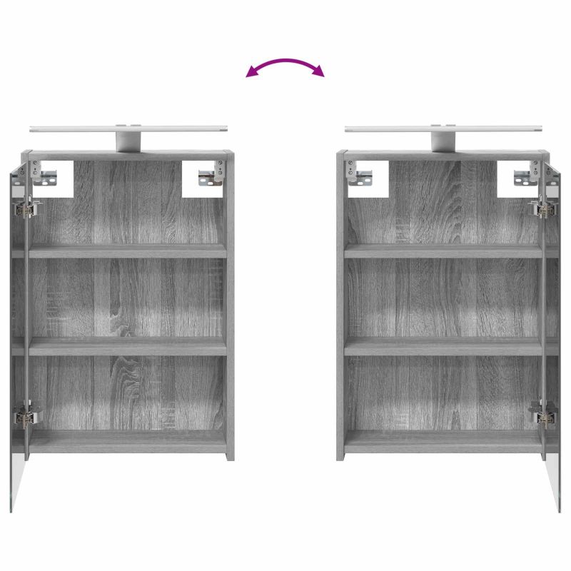 Този комплект шкафове за баня предлага стилно и практично решение за съвременни бани. С инженерна дървесина и елегантни линии, шкафът разполага с огледало, което не само увеличава визуално пространството, но и добавя интрига и многофункционалност. Идеален е за собственици на жилища и дизайнери, предоставя ефективно съхраняване и подобрява визията на банята. Минималистичният дизайн и LED осветлението го правят перфектната комбинация от форма и функция. Конструкция от инженерна дървесина: Този шкаф е здрав и издържлив, запазвайки красивия си вид дори при променящи се условия. Материалът е гладък, лесен за почистване и устойчив на износване. Двойно функционални врати: Стъклените врати са елегантни и удобни, разкривайки огромни отделения за съхранение на лични неща и основни принадлежности за банята. Те минимализират безредиците и максимизират организацията. Инновационно осветление: LED лентите осигуряват оптимално осветление за грижа за косата и подобряват атмосферата в банята. Захранвани с USB, те трансформират шкафа в нещо повече от просто място за съхранение. Двупосочно огледало: Уникално проектирано, огледалото добавя дълбочина на шкафа и е идеално за бани, които се нуждаят от частност. Лесен монтаж на стена: Проектирано е за съвременни жилища и може да се монтира на стена, освобождавайки ценна подова площ. Моля, обърнете внимание, че трябва да използвате само сертифициран вход DC 5V. По-високото напрежение може да доведе до прегряване и да повреди устройството, както и до потенциален риск от прегряване и пожар. Не свързвайте този продукт към захранване, различно от описаното в ръководството, на табелката с името или изрично препоръчано от vidaXL. Този уред не трябва да се използва от деца под 15 години, както и от лица с намалени физически, сетивни или умствени способности или с липса на опит и познания относно използването на електронни уреди. Електричеството е опасно. Повредите и неправилният монтаж, употреба или промяна (подмяна на отделни компоненти) могат да доведат до повреда на уреда , което да доведе до токов удар и опасност за потребителя. Не използвайте този продукт във взривоопасна атмосфера, като например при наличие на запалими течности, газове и прах, или при температура над 50 градуса по Целзий или повече. Не включвайте продукта, ако свързващият кабел или захранването са видимо повредени. Ако външният гъвкав кабел или захранващ кабел на това осветително тяло е повреден, той трябва да бъде заменен изключително от производителя или негов сервизен агент, или от подобно квалифицирано лице, за да се избегне опасност. Изключете захранването по време на монтажа и поддръжката. Уверете се, че крушките са изстинали. Светлинният източник на това осветително тяло не може да се заменя; когато светлинният източник достигне края на експлоатационния си срок, цялото осветително тяло трябва да се замени. Само за употреба на закрито, не използвайте този продукт на открито.