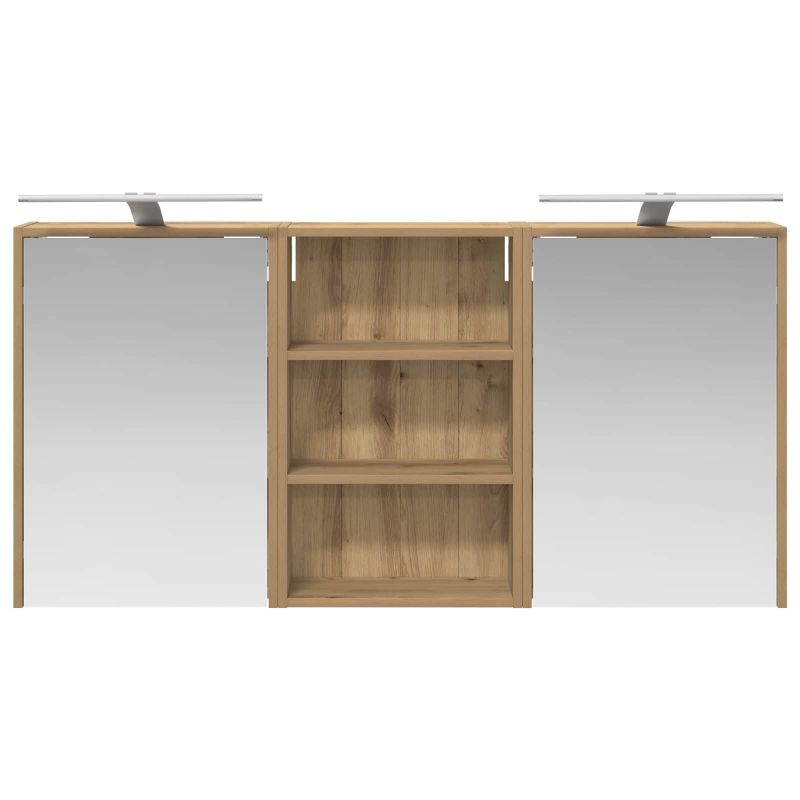 Този комплект шкафове за баня предлага стилно и практично решение за съвременни бани. С инженерна дървесина и елегантни линии, шкафът разполага с огледало, което не само увеличава визуално пространството, но и добавя интрига и многофункционалност. Идеален е за собственици на жилища и дизайнери, предоставя ефективно съхраняване и подобрява визията на банята. Минималистичният дизайн и LED осветлението го правят перфектната комбинация от форма и функция. Конструкция от инженерна дървесина: Този шкаф е здрав и издържлив, запазвайки красивия си вид дори при променящи се условия. Материалът е гладък, лесен за почистване и устойчив на износване. Двойно функционални врати: Стъклените врати са елегантни и удобни, разкривайки огромни отделения за съхранение на лични неща и основни принадлежности за банята. Те минимализират безредиците и максимизират организацията. Инновационно осветление: LED лентите осигуряват оптимално осветление за грижа за косата и подобряват атмосферата в банята. Захранвани с USB, те трансформират шкафа в нещо повече от просто място за съхранение. Двупосочно огледало: Уникално проектирано, огледалото добавя дълбочина на шкафа и е идеално за бани, които се нуждаят от частност. Лесен монтаж на стена: Проектирано е за съвременни жилища и може да се монтира на стена, освобождавайки ценна подова площ. Моля, обърнете внимание, че трябва да използвате само сертифициран вход DC 5V. По-високото напрежение може да доведе до прегряване и да повреди устройството, както и до потенциален риск от прегряване и пожар. Не свързвайте този продукт към захранване, различно от описаното в ръководството, на табелката с името или изрично препоръчано от vidaXL. Този уред не трябва да се използва от деца под 15 години, както и от лица с намалени физически, сетивни или умствени способности или с липса на опит и познания относно използването на електронни уреди. Електричеството е опасно. Повредите и неправилният монтаж, употреба или промяна (подмяна на отделни компоненти) могат да доведат до повреда на уреда , което да доведе до токов удар и опасност за потребителя. Не използвайте този продукт във взривоопасна атмосфера, като например при наличие на запалими течности, газове и прах, или при температура над 50 градуса по Целзий или повече. Не включвайте продукта, ако свързващият кабел или захранването са видимо повредени. Ако външният гъвкав кабел или захранващ кабел на това осветително тяло е повреден, той трябва да бъде заменен изключително от производителя или негов сервизен агент, или от подобно квалифицирано лице, за да се избегне опасност. Изключете захранването по време на монтажа и поддръжката. Уверете се, че крушките са изстинали. Светлинният източник на това осветително тяло не може да се заменя; когато светлинният източник достигне края на експлоатационния си срок, цялото осветително тяло трябва да се замени. Само за употреба на закрито, не използвайте този продукт на открито.