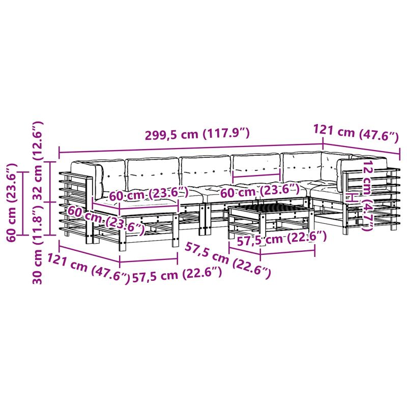 Този модулен комплект за градински отдих е перфектният вариант за всеки, който обича съвременния дизайн и удобството. Подходящ е за градината или терасата и комбинира естетика с комфорт, идеален за слънчеви дни или забавления с приятели и семейство. С гладка текстура и стилен профил, площадката осигурява качество и здравина. Представете си приятни следобеди, прекарани на открито без да се отказвате от стил и удобство. Качество на материала: Комплектът е направен от масивна борова дървесина, известна със здравината си и привлекателната текстура. Тази издръжлива дървесина издържа на времето, така че комплектът за отдих остава идеален за събирания сезон след сезон. С атрактивно покритие, той перфектно се интегрира в откритото пространство. Дизайн на компонентите: Със здрави бордови подлакътници и стилни крака, всяка част предлага удобно сядане и повишава съвременния вид на комплекта. Тези компоненти създават баланс между функция и естетика. Функционални характеристики: Комплектът е създаден за дълготрайност и комфорт. Модулният дизайн позволява персонализиране и създаване на оптимални условия за събирания или самостоятелна почивка. Адаптивна употреба: Идеален за градини и тераси, този комплект се нагажда лесно към всякакви открити пространства. Той служи отлично за летни партита, семейни празници или просто за почивка навън. Грижи и поддръжка: За да поддържате комплекта в отлично състояние, избягвайте пряка слънчева светлина и ползвайте защитно покритие, когато не е в употреба. Съхранявайте възглавниците на сухо, когато времето е лошо, и внимателно почиствайте повърхностите, за да запазите първоначалния вид на комплекта.