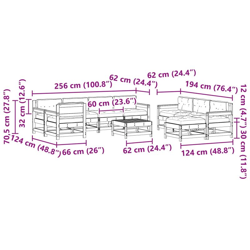 Този модулен комплект за градина е идеален избор за създаване на уютна и луксозна зона за сядане на открито. Създаден с грижа за съвременния собственик, той комбинира елегантен дизайн с много функционалност, правейки го перфектен за градини и тераси. Докато създаваш спокойно и стилно открито пространство, комплектът лесно допълва визията ти, предлагайки естетика и практичност. Конструкция от масивна борова дървесина Всеки елемент от този комплект е направен от масивен бор, осигуряващ здравина и гладка повърхност. Устойчивият бор е чудесен избор за градински мебели, защото е влагоустойчив и издържа на всякакви промени във времето. Перфектното решение за открито, този материал осигурява дълготрайност и притежава красота. Модулна многофункционалност Комплектът разполага с модулен дизайн, който дава възможност за лесно пренареждане, за да отговаря на различни пространства и събирания. Идеален е за адаптиране към променящите се нужди на откритото, така че можеш да сменяш подредбата за по-големи или интимни заг gatherings, а откритото ти пространство остава свежо. Комфорт с възглавници от полипропиленови влакна Комплектът включва уютни възглавници, пълнени с полипропилен, известни с влагоустойчивостта и лекотата си. Тези материали гарантират комфорт с малко поддръжка, позволявайки дълги случаи на престой без загуба на качество или спокойствие. Оформените подложки добавят комфорт на открито. Всеобхватни компоненти на комплекта Този комплект включва различни части, като маса, ъглови дивани, средни дивани и табуретка, както и големи възглавници за сядане и за гърба. Всеки елемент допринася за хармонична открита обстановка, подходяща както за социални, така и за уютни моменти. Лесна поддръжка и грижа За да поддържаш комплекта в отлично състояние, избегни пряката слънчевата светлина и използвай покривало, когато не го ползваш. Препоръчително е също така да внасяш възглавниците вътре при лошо време, за да запазиш мебелите си здрави през сезоните.