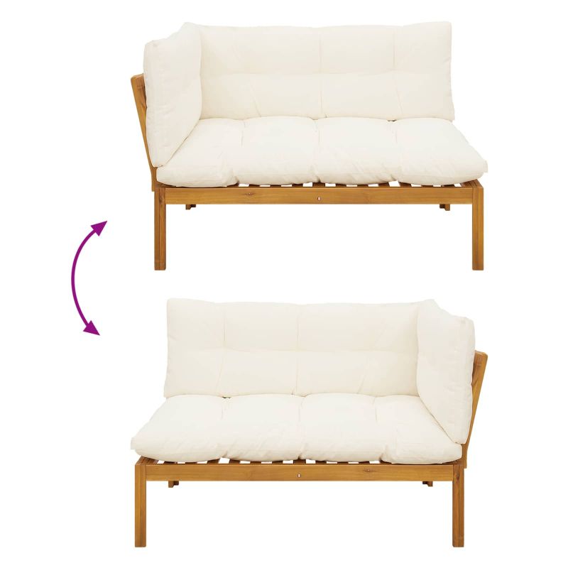 Този комплект градински диван с рустикален стил е идеален за комфортно сядане на открито. Изработен е от стабилна акациева дървесина, а рамката е в топли тонове и красиви шарки, които се вписват чудесно в градинската или терасната обстановка. Конфигурацията с ъгъл ви позволява да създадете уютно пространство, а съвпадащата маса е перфектна за напитки или малки неща. Възглавниците с плоска подложка и леко наклонен гръб ще ви осигурят опора за почивка на открито. Изработен от акациево дърво Рамката, гърба, краката и седалките са от здрава акациева дървесина, която е устойчива на атмосферни влияния и има чудесна текстура. Тя придава натурален вид и осигурява стабилност за градинския диван. Фиксирана рамка с ламели С твърда рамка от ламели, диванът предлага стабилна и удобна опора. Този дизайн е направен за честа употреба на открито. Водоотблъскващи свойства Създаден за външни условия, този диван помага да запази вида и структурата си при дъжд или слънце, гарантирайки дългаторенна употреба. Ъглова конфигурация и маса Проектиран в ъглова форма, този модел максимално използва простора и предлага уютна дневна зона. Включената маса е идеална за напитки или закуски. Лесна поддръжка Просто изтрийте дивана с влажна кърпа, за да се запази добрият му вид. Минималните нужди от поддръжка го правят удобен за използване на открито. Максимално 110 кг на седалка.