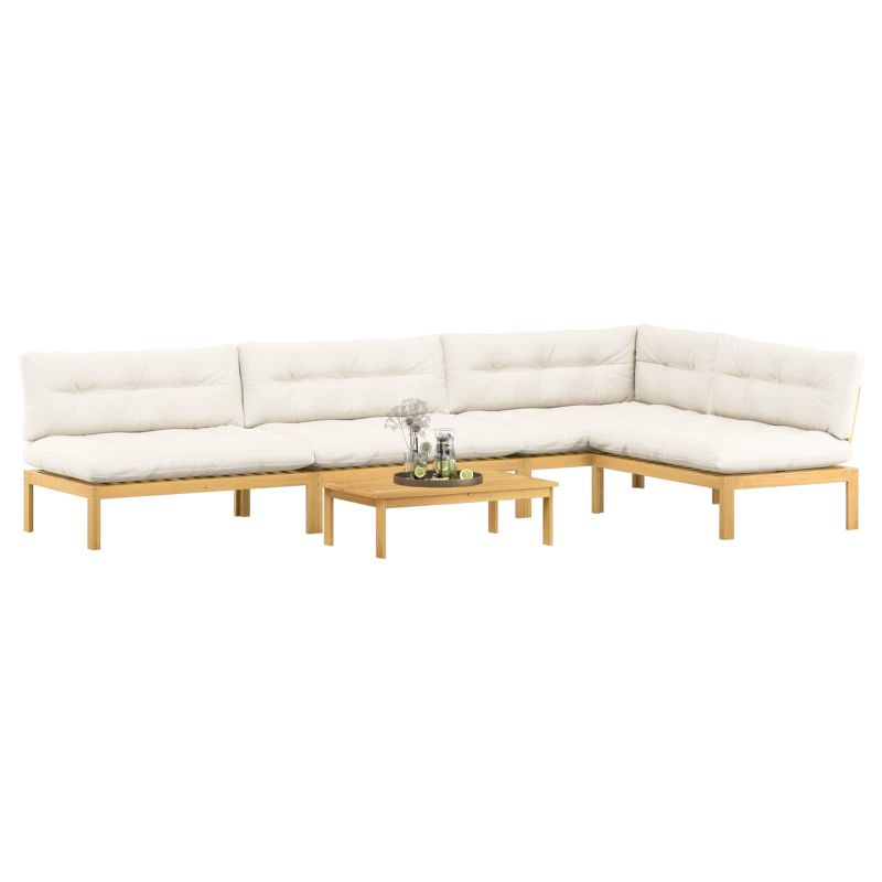Този комплект градински диван с рустикален стил е идеален за комфортно сядане на открито. Изработен е от стабилна акациева дървесина, а рамката е в топли тонове и красиви шарки, които се вписват чудесно в градинската или терасната обстановка. Конфигурацията с ъгъл ви позволява да създадете уютно пространство, а съвпадащата маса е перфектна за напитки или малки неща. Възглавниците с плоска подложка и леко наклонен гръб ще ви осигурят опора за почивка на открито. Изработен от акациево дърво Рамката, гърба, краката и седалките са от здрава акациева дървесина, която е устойчива на атмосферни влияния и има чудесна текстура. Тя придава натурален вид и осигурява стабилност за градинския диван. Фиксирана рамка с ламели С твърда рамка от ламели, диванът предлага стабилна и удобна опора. Този дизайн е направен за честа употреба на открито. Водоотблъскващи свойства Създаден за външни условия, този диван помага да запази вида и структурата си при дъжд или слънце, гарантирайки дългаторенна употреба. Ъглова конфигурация и маса Проектиран в ъглова форма, този модел максимално използва простора и предлага уютна дневна зона. Включената маса е идеална за напитки или закуски. Лесна поддръжка Просто изтрийте дивана с влажна кърпа, за да се запази добрият му вид. Минималните нужди от поддръжка го правят удобен за използване на открито. Максимално 110 кг на седалка.