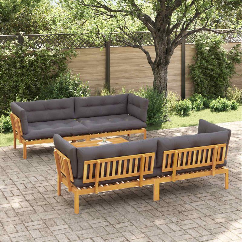 Този комплект градински диван с рустикален стил е идеален за комфортно сядане на открито. Изработен е от стабилна акациева дървесина, а рамката е в топли тонове и красиви шарки, които се вписват чудесно в градинската или терасната обстановка. Конфигурацията с ъгъл ви позволява да създадете уютно пространство, а съвпадащата маса е перфектна за напитки или малки неща. Възглавниците с плоска подложка и леко наклонен гръб ще ви осигурят опора за почивка на открито. Изработен от акациево дърво Рамката, гърба, краката и седалките са от здрава акациева дървесина, която е устойчива на атмосферни влияния и има чудесна текстура. Тя придава натурален вид и осигурява стабилност за градинския диван. Фиксирана рамка с ламели С твърда рамка от ламели, диванът предлага стабилна и удобна опора. Този дизайн е направен за честа употреба на открито. Водоотблъскващи свойства Създаден за външни условия, този диван помага да запази вида и структурата си при дъжд или слънце, гарантирайки дългаторенна употреба. Ъглова конфигурация и маса Проектиран в ъглова форма, този модел максимално използва простора и предлага уютна дневна зона. Включената маса е идеална за напитки или закуски. Лесна поддръжка Просто изтрийте дивана с влажна кърпа, за да се запази добрият му вид. Минималните нужди от поддръжка го правят удобен за използване на открито.
