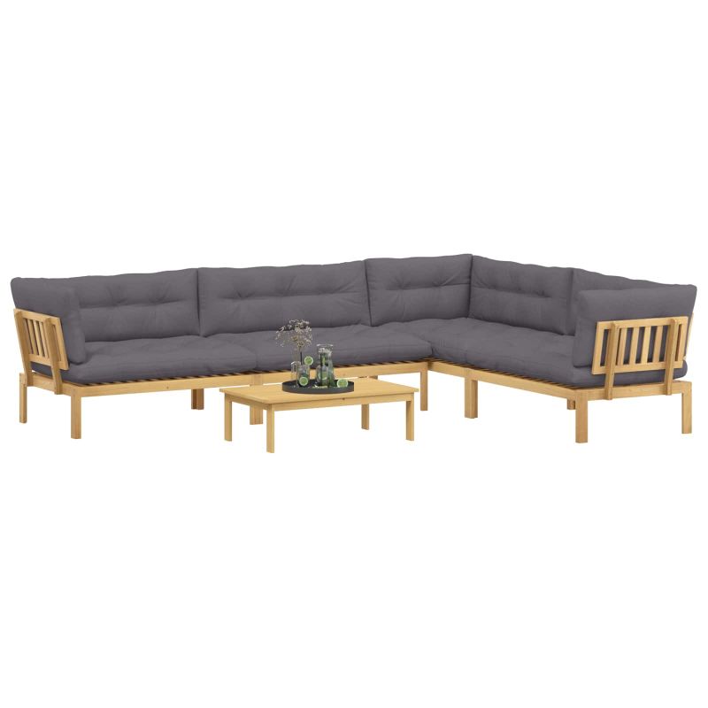 Този комплект градински диван с рустикален стил е идеален за комфортно сядане на открито. Изработен е от стабилна акациева дървесина, а рамката е в топли тонове и красиви шарки, които се вписват чудесно в градинската или терасната обстановка. Конфигурацията с ъгъл ви позволява да създадете уютно пространство, а съвпадащата маса е перфектна за напитки или малки неща. Възглавниците с плоска подложка и леко наклонен гръб ще ви осигурят опора за почивка на открито. Изработен от акациево дърво Рамката, гърба, краката и седалките са от здрава акациева дървесина, която е устойчива на атмосферни влияния и има чудесна текстура. Тя придава натурален вид и осигурява стабилност за градинския диван. Фиксирана рамка с ламели С твърда рамка от ламели, диванът предлага стабилна и удобна опора. Този дизайн е направен за честа употреба на открито. Водоотблъскващи свойства Създаден за външни условия, този диван помага да запази вида и структурата си при дъжд или слънце, гарантирайки дългаторенна употреба. Ъглова конфигурация и маса Проектиран в ъглова форма, този модел максимално използва простора и предлага уютна дневна зона. Включената маса е идеална за напитки или закуски. Лесна поддръжка Просто изтрийте дивана с влажна кърпа, за да се запази добрият му вид. Минималните нужди от поддръжка го правят удобен за използване на открито. Максимално 110 кг на седалка.