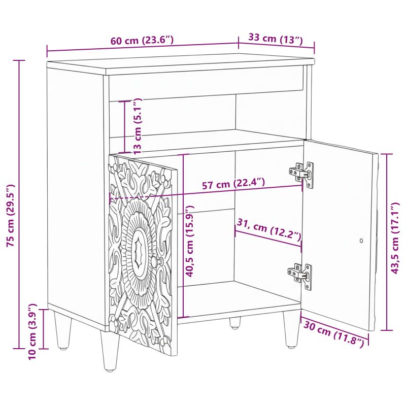 • Общи размери: 60 x 33,5 x 75 см (Д x Ш x В)