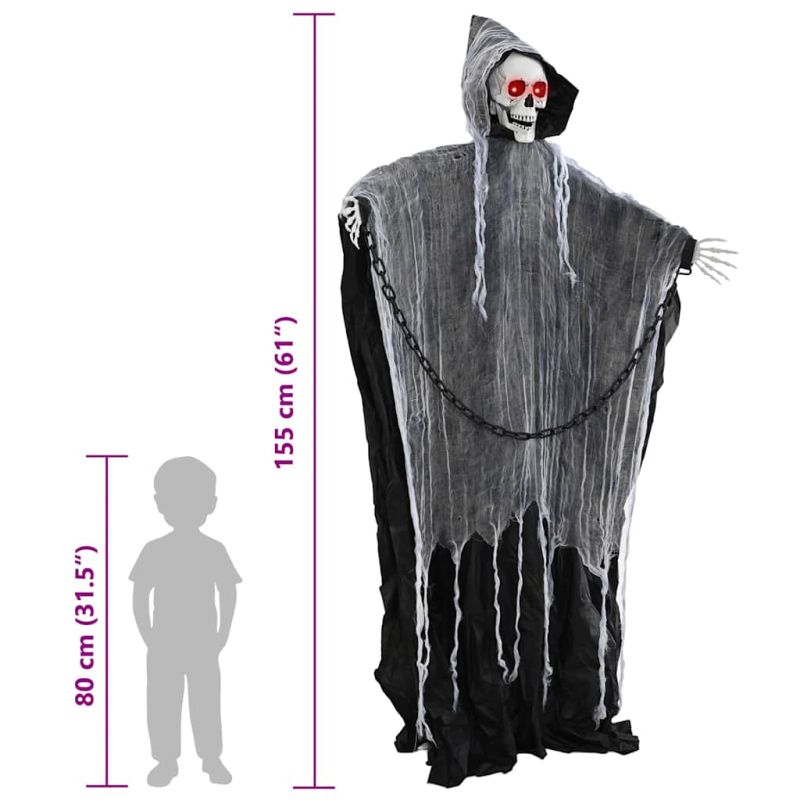 Този Хелоуински Жътвар е супер привлекателна декорация, която напълно ще промени атмосферата у вас. Идеален е за купони с приятели и семейство, смесва готически елементи, за да създаде зловеща обстановка. Голям е и с ярки детайли, така че лесно привлича погледите. Регулируемите ръце и звуците, активирани от движение, придават интерактивност, а на гостите им осигуряват неочаквани трепети. Материали: Правен е от здрав полиестер и стабилна пластмаса, Така че ще преживее много сезони на забавления. Полиестерът е мек, а пластмасата му запазва формата. Тези материали помагат на жътвара да изглежда зловещо през Хелоуин. Включени компоненти: Червените LED очи му светят ярко, създавайки зловещо присъствие. Работи с батерии, което означава, че можеш да го сложиш навсякъде, без да се притесняваш за контакти. Този дизайн поддържа страховитата сцена непрекъсната, добавяйки зловеща атмосфера. Характеристики / Функция / Дизайн: Звуци и движения, задействани от движение на разстояние до 50 см, допълнително повишават фактор на страх. Регулируемите ръце ти дават възможност да сменяш позите му, добавяйки ефект на разнообразие на дисплеите. Тези интерактивни функции правят Хелоуин още по-вълнуващ за твоите гости. Препоръчителни употреби: Перфектен за преобразяване на всекидневната в зловещо пространство, този жътвар идеално се вписва в готическия декор. Лесен е за инсталиране и безопасен за употреба на закрито, така че ще бъде защитен от лошо време. Грижа и поддръжка: Направен да издържи, жътварят се нуждае от минимална грижа. Просто го дръж далеч от огън и го съхранявай на сухо след Хелоуин, за да бъде в добро състояние. С малко усилия, жътварят ще е готов за следващия път.