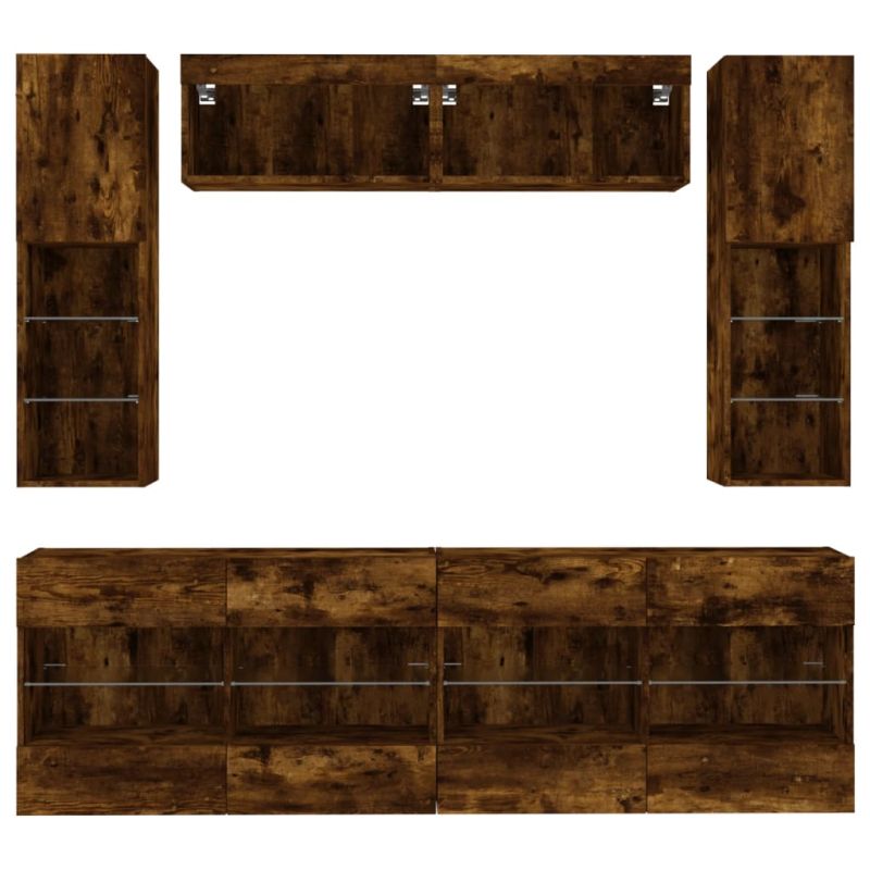 Комплект ТВ стенни шкафове, 6 части, с LED светлини, опушен дъб